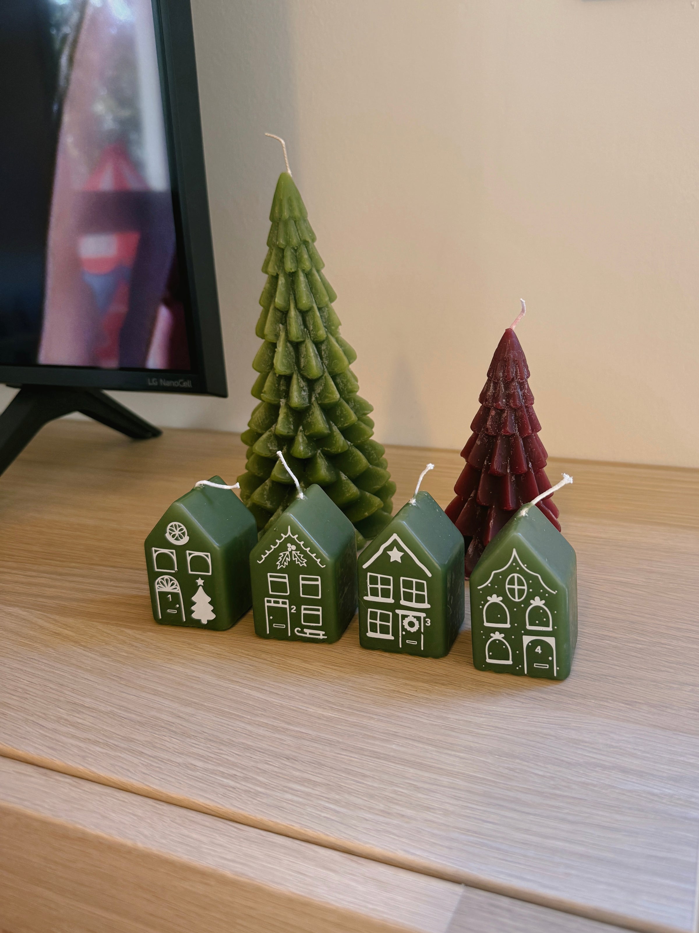 Packung mit 4 Kerzen in Form von Weihnachtshäuschen, erhältlich in drei verschiedenen Farben!
