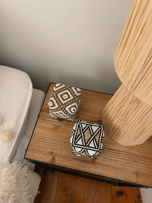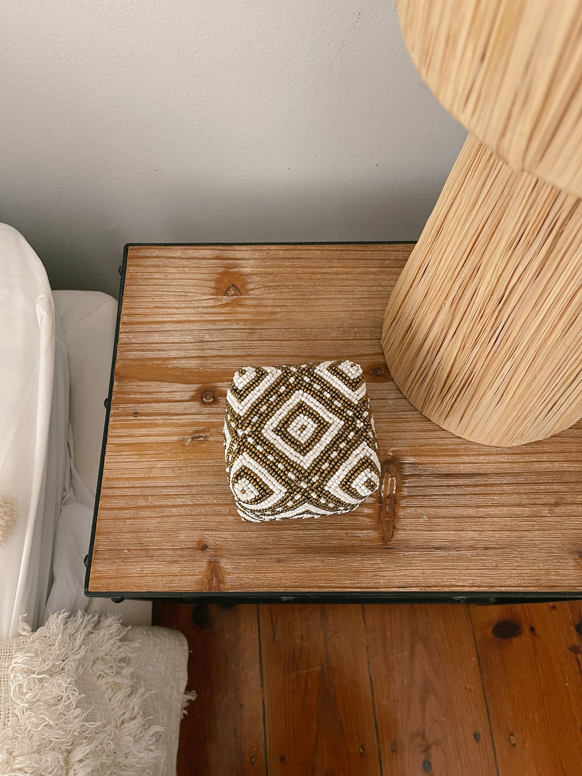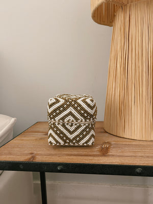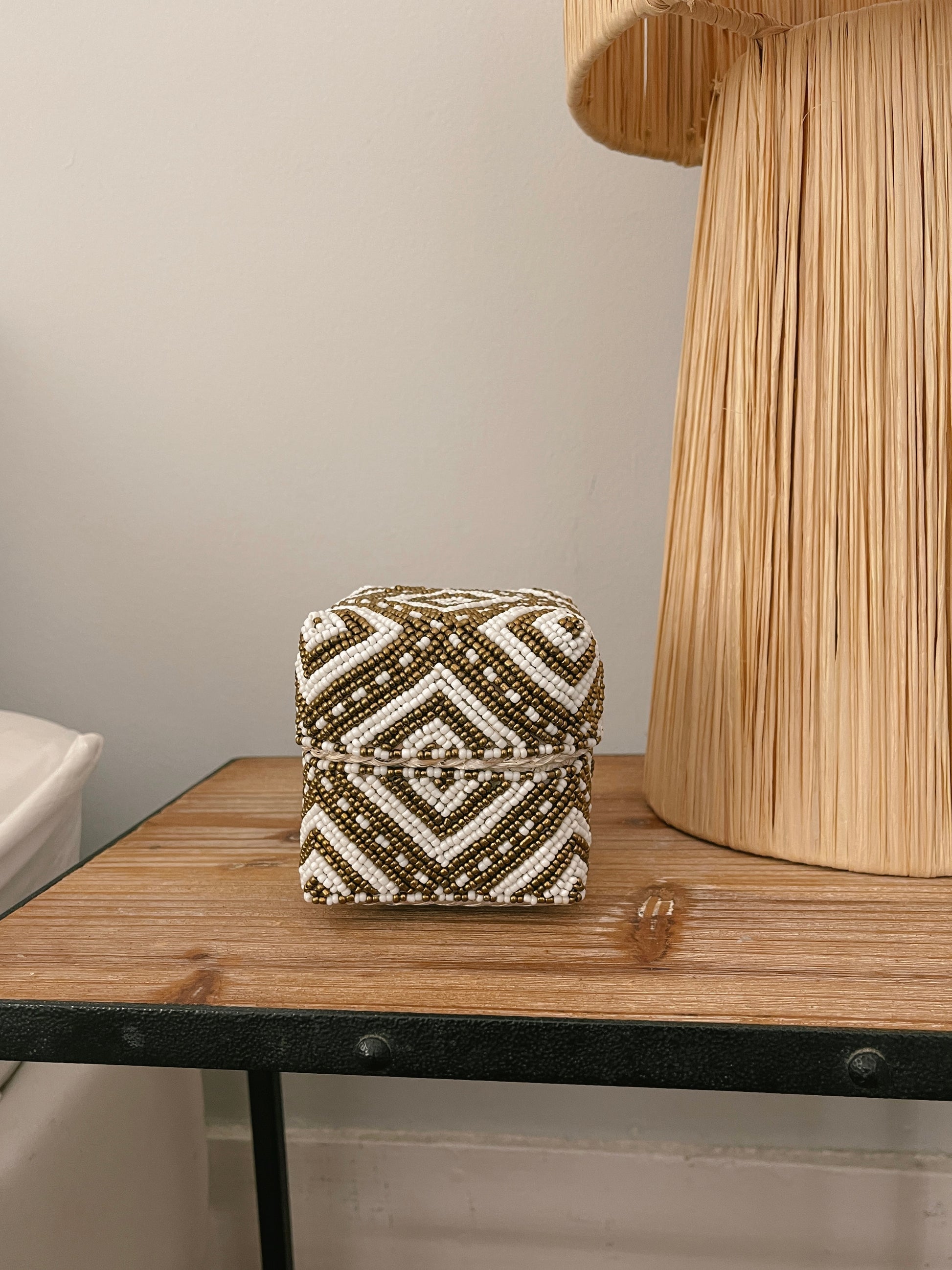 Verleihen Sie Ihrem Zuhause mit unserer handgefertigten Bambusbox, die mit weißen und goldenen Perlen verziert ist, einen Hauch von Boho-Chic-Stil. Diese charmante Box ist mehr als nur ein einfacher Behälter für Schmuck – sie ist ein einzigartiges Dekorationsstück, das Ihrem Raum Charme und Persönlichkeit verleiht.