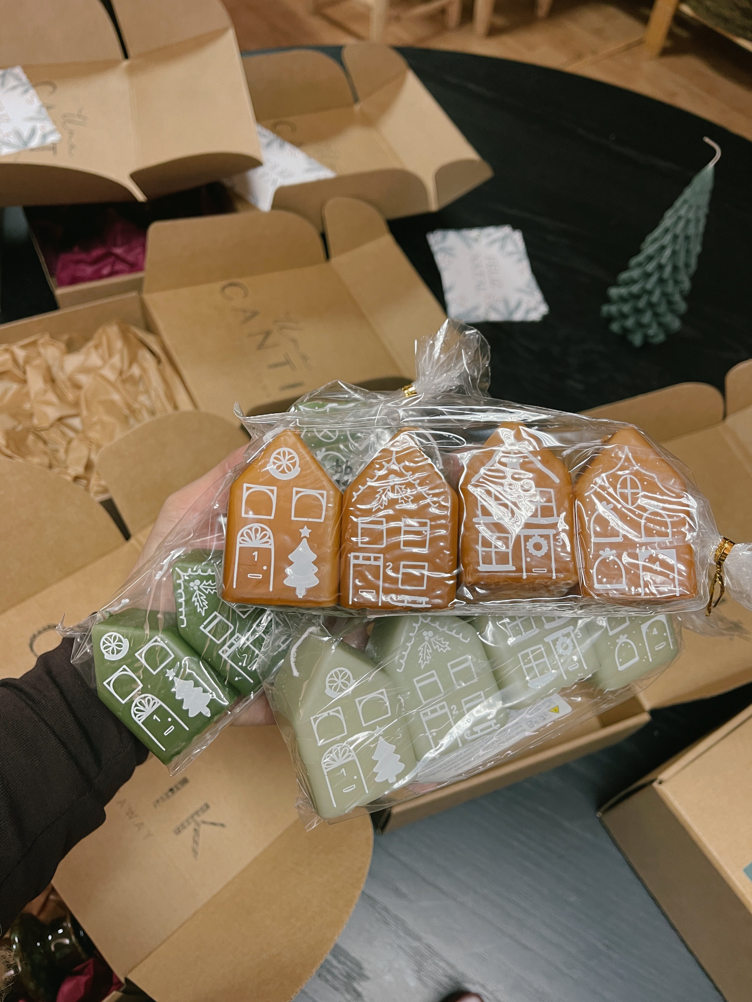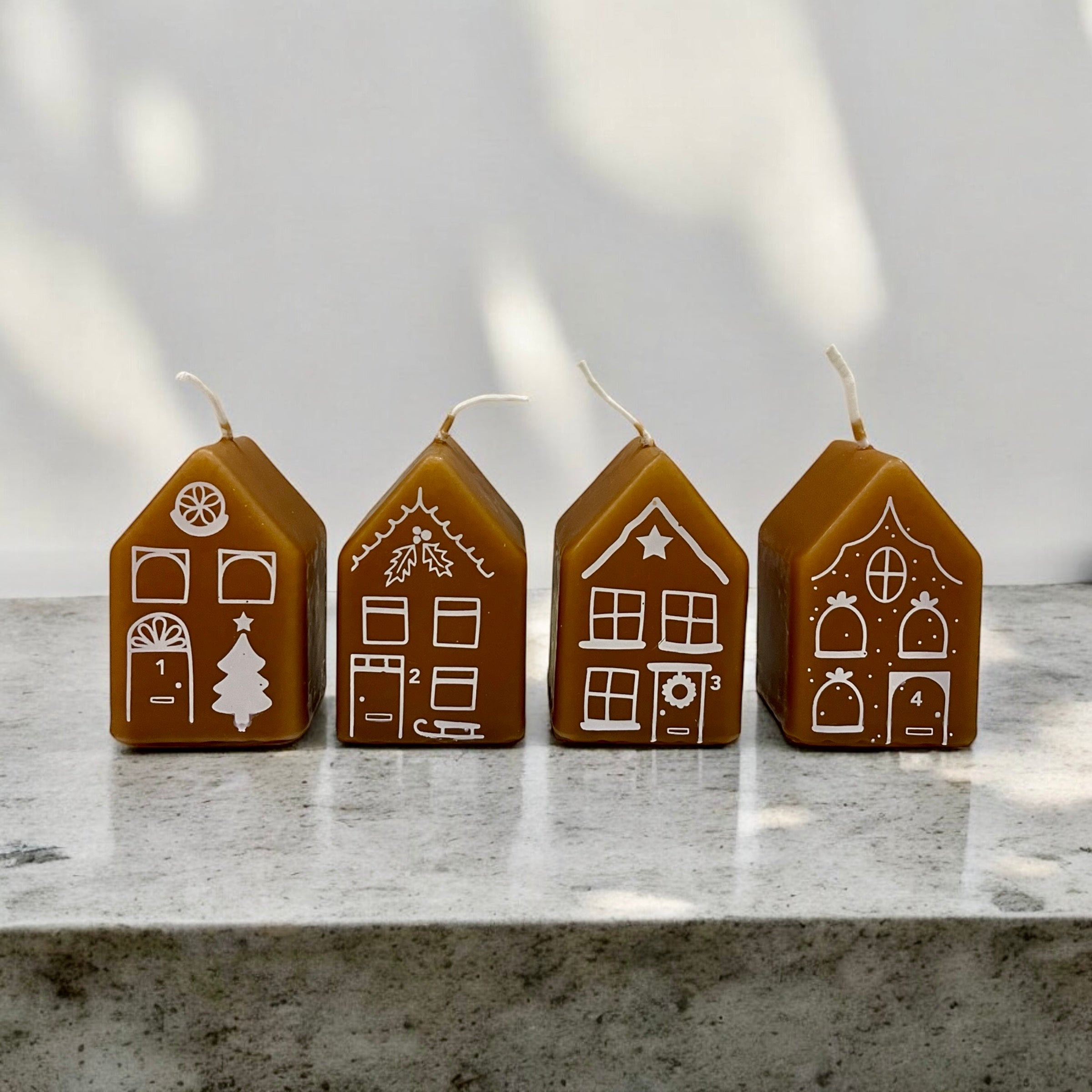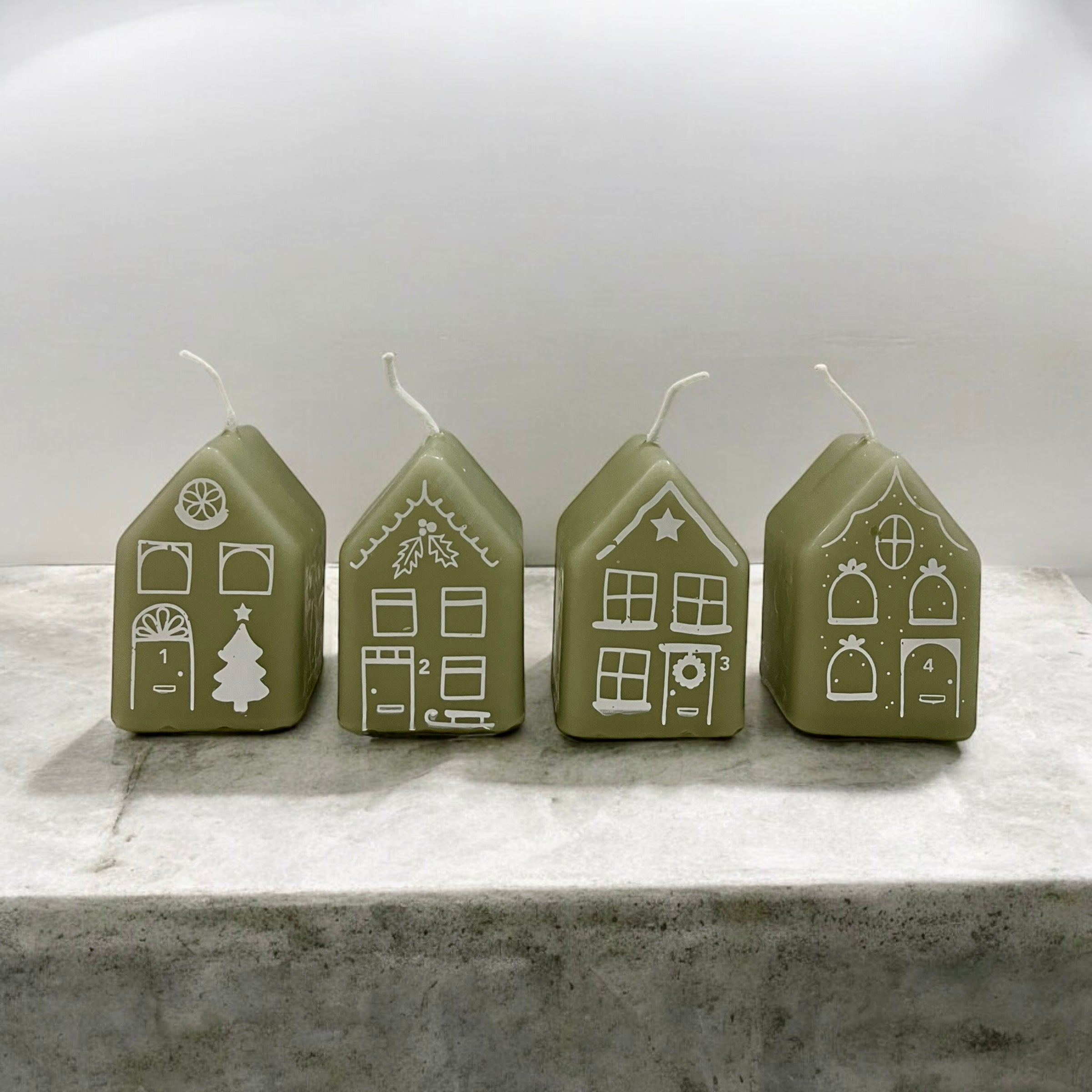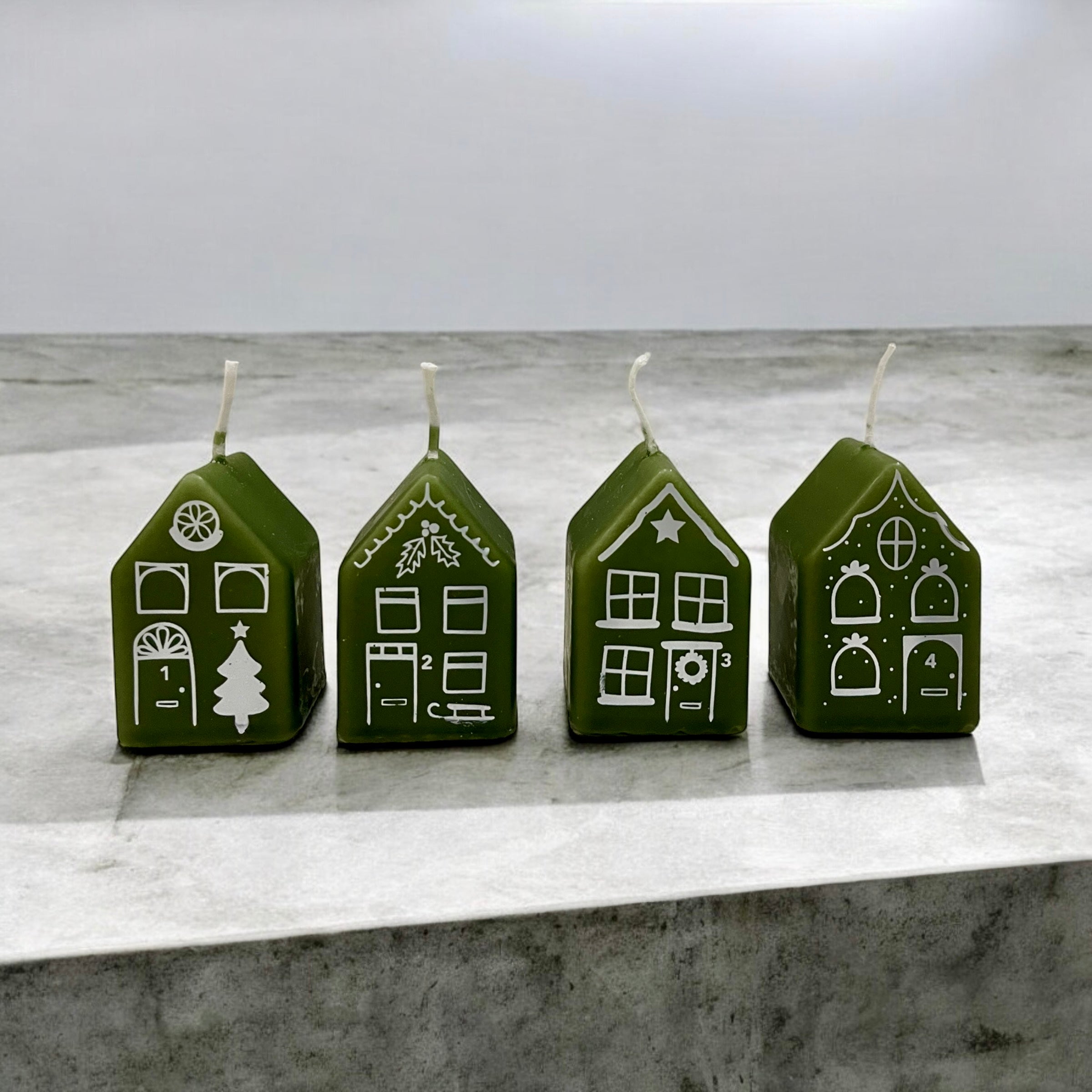 Packung mit 4 Kerzen in Form von Weihnachtshäuschen, erhältlich in drei verschiedenen Farben!
