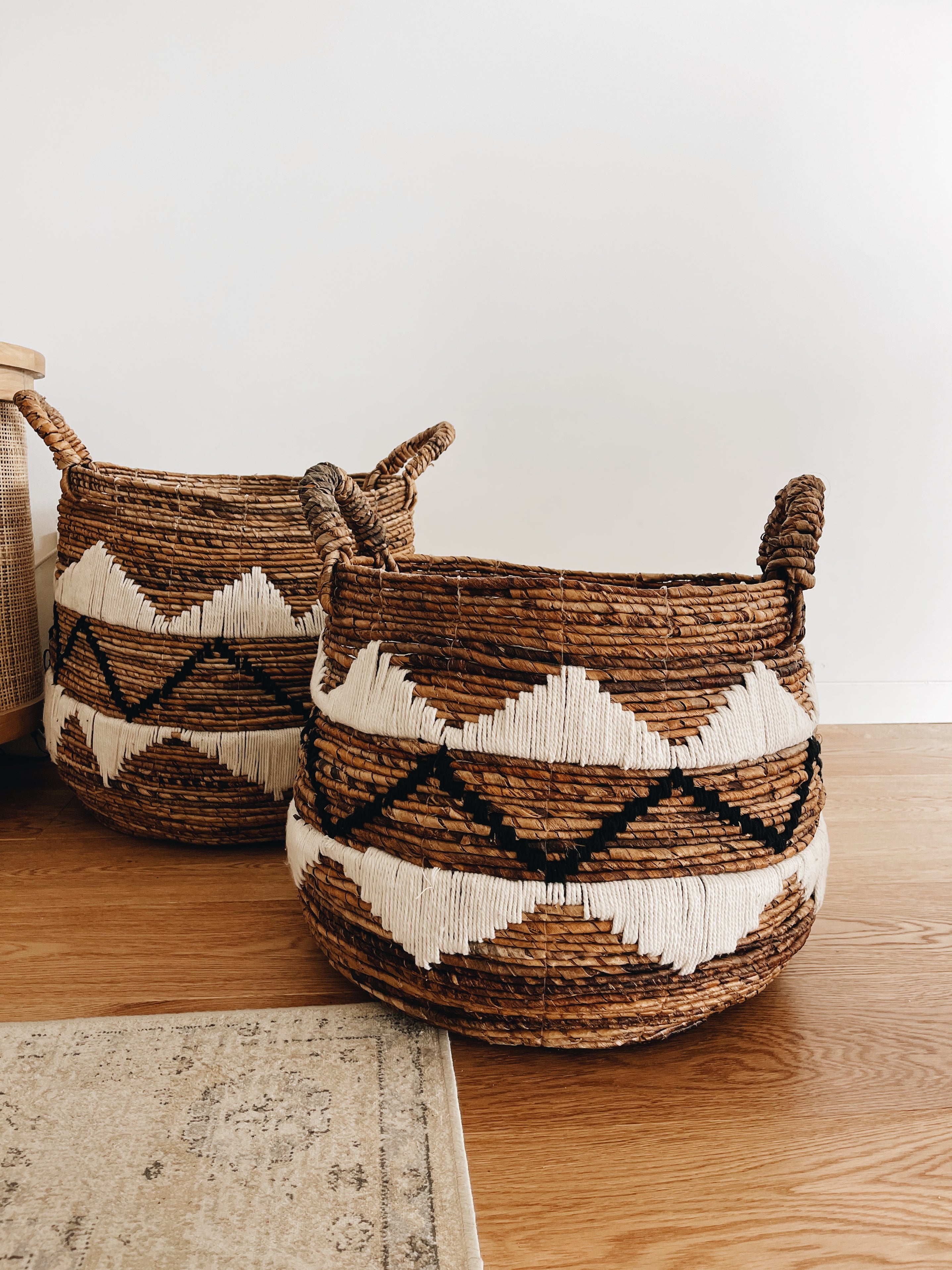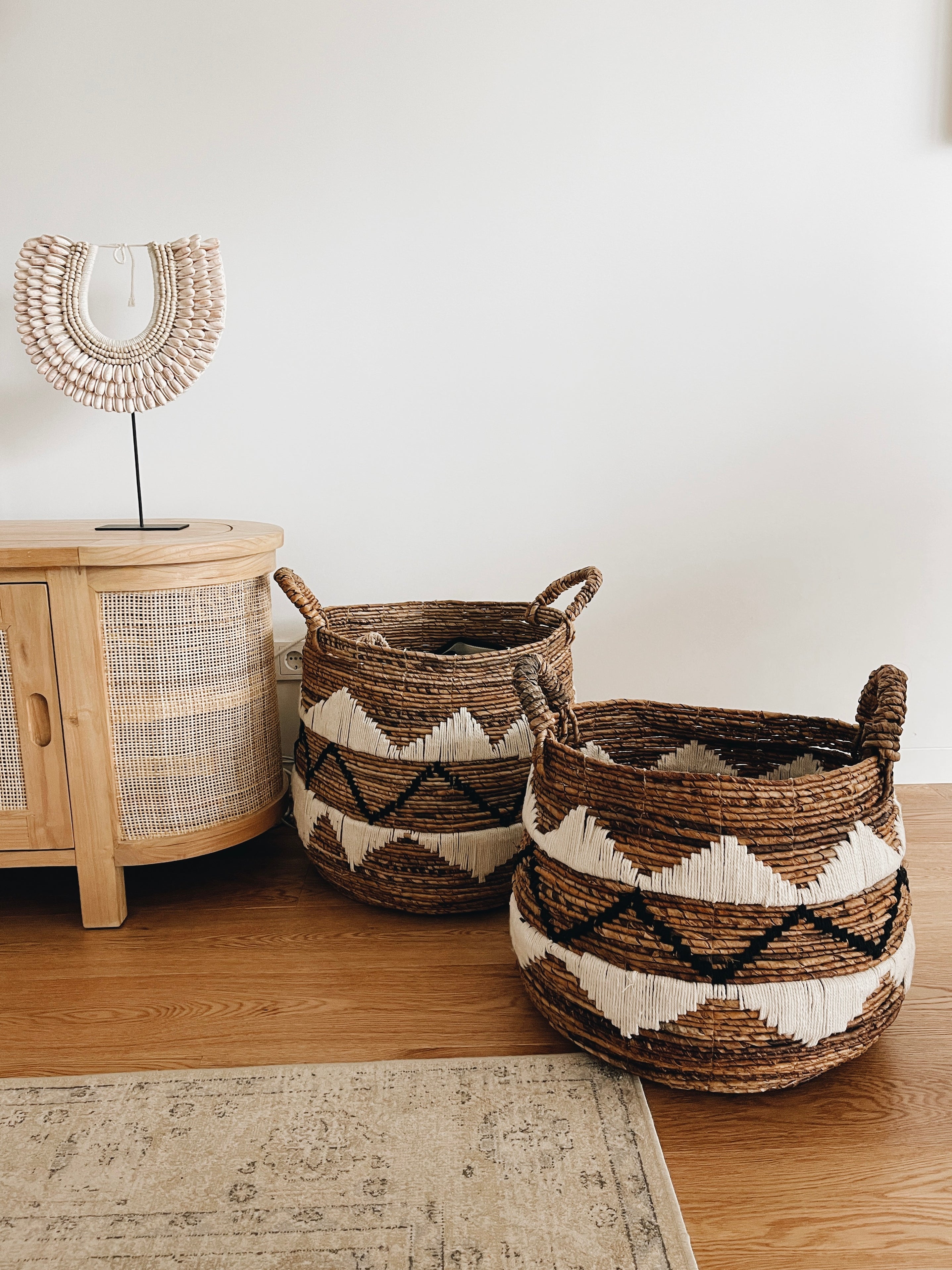 Discover our Lospalos Oval Baskets, made from banana leaves and adorned with soft cotton details in geometric patterns, black and white.