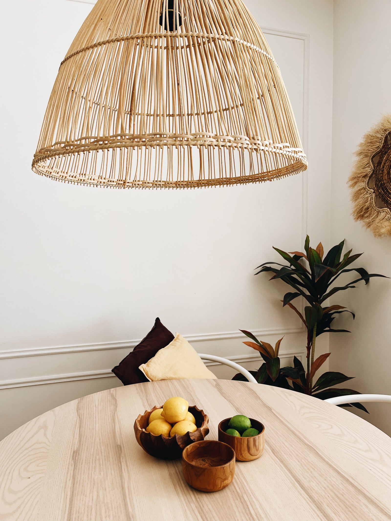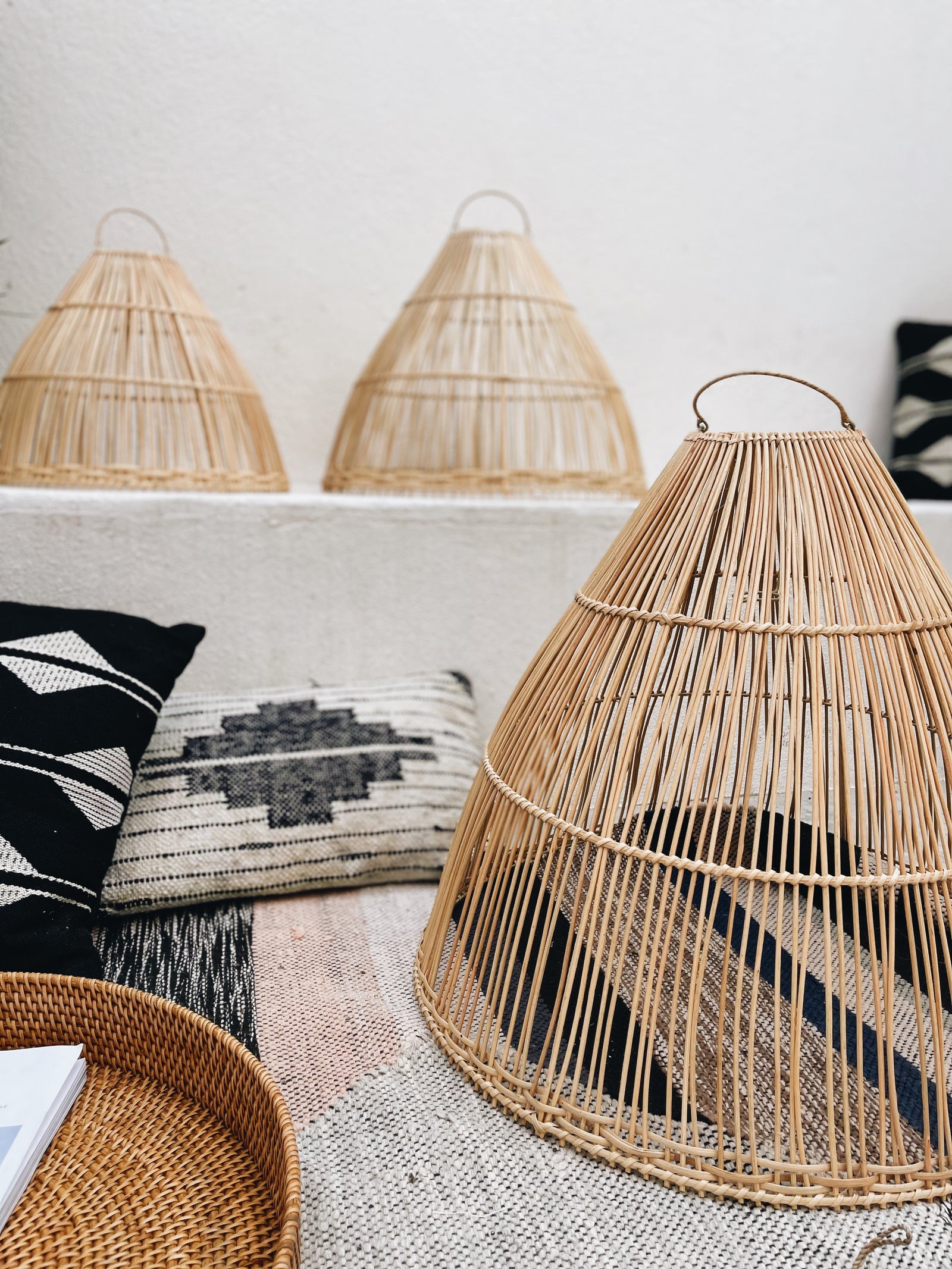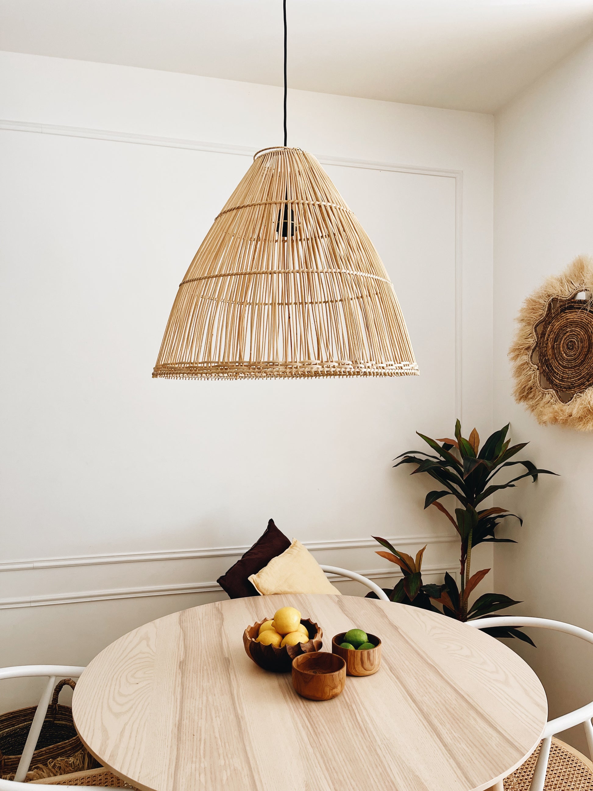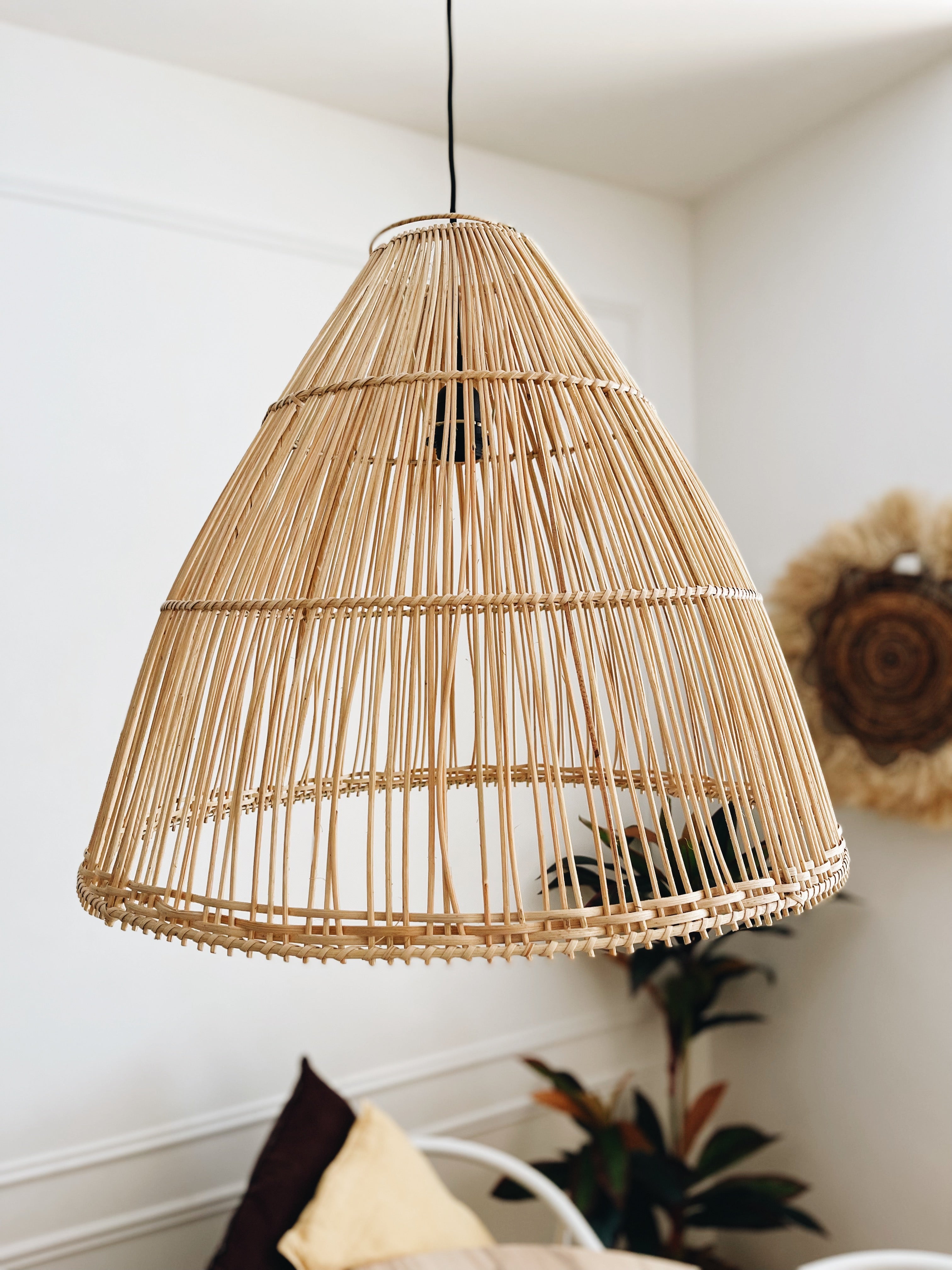 Con su forma cónica, esta lámpara de ratán proporciona una distribución uniforme de la luz, creando una atmósfera suave y acogedora. Ideal para su uso en salas de estar, dormitorios o áreas de lectura, esta lámpara es una elección versátil y elegante para iluminar su espacio con estilo.