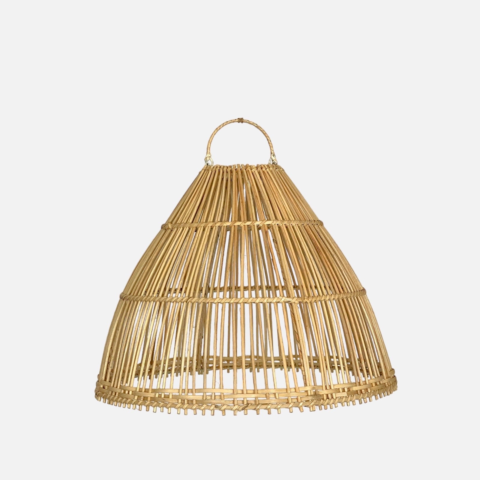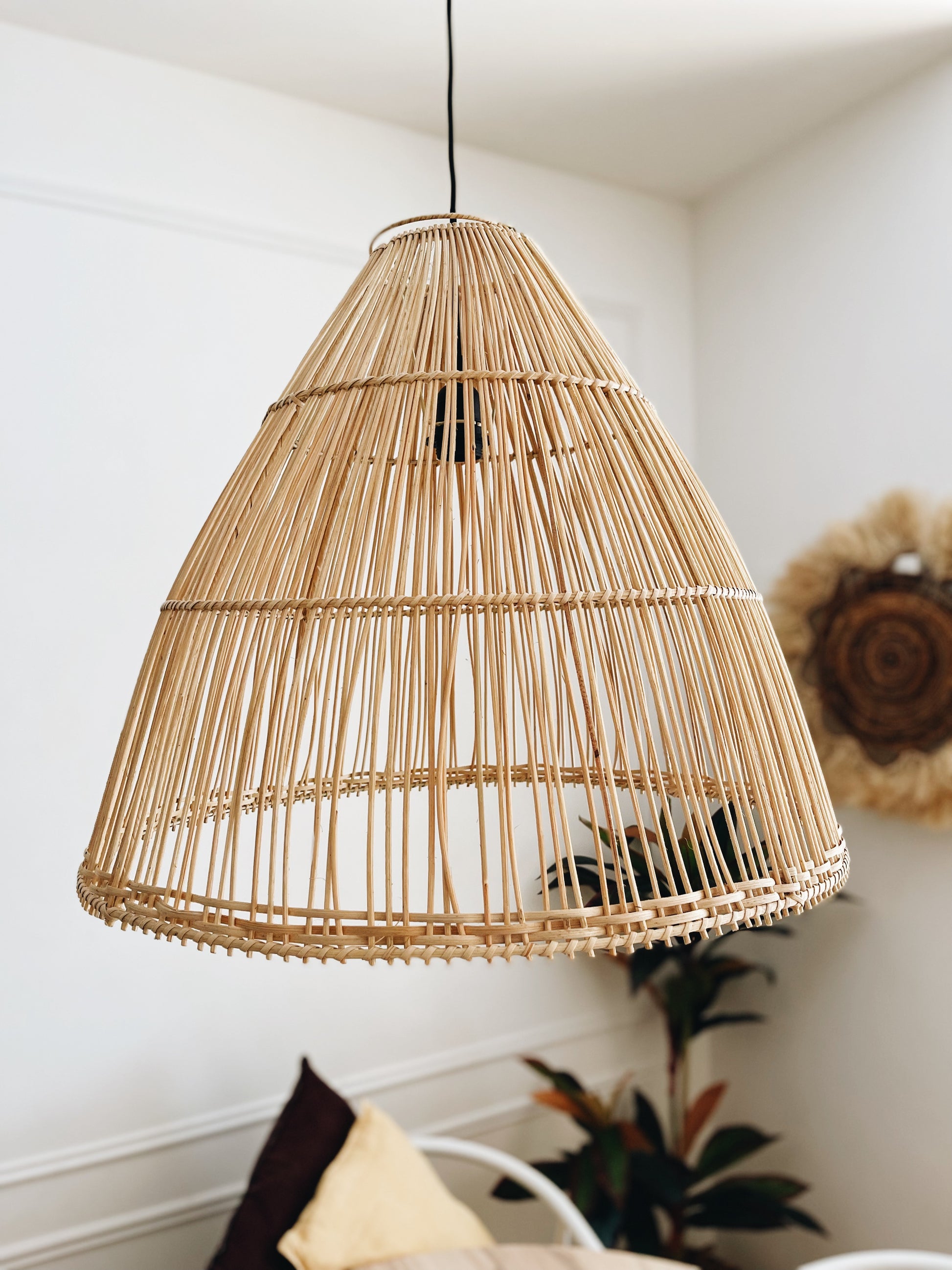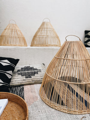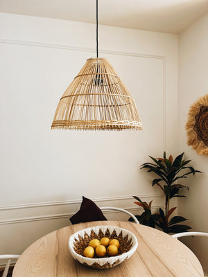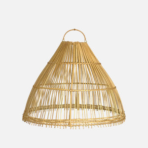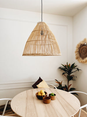 Presentamos nuestra elegante lámpara de ratán Bobonaro, de tamaño grande, en forma de cono, una pieza de iluminación que combina estilo y funcionalidad.