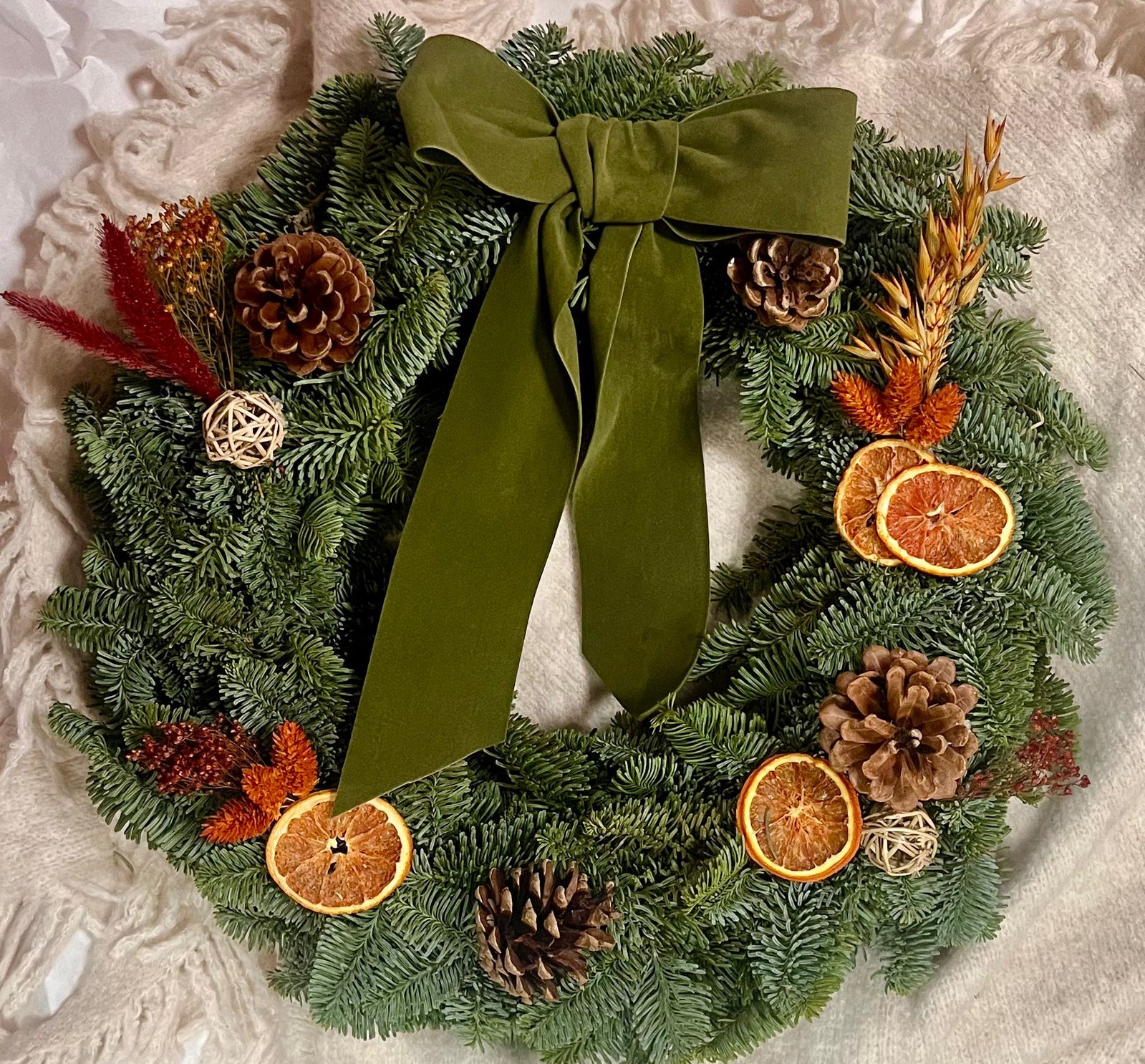 ✨ Cada corona está cuidadosamente elaborada con flores secas seleccionadas y ramas de pino natural; todas hechas a mano. con cinta roja o burdeos.