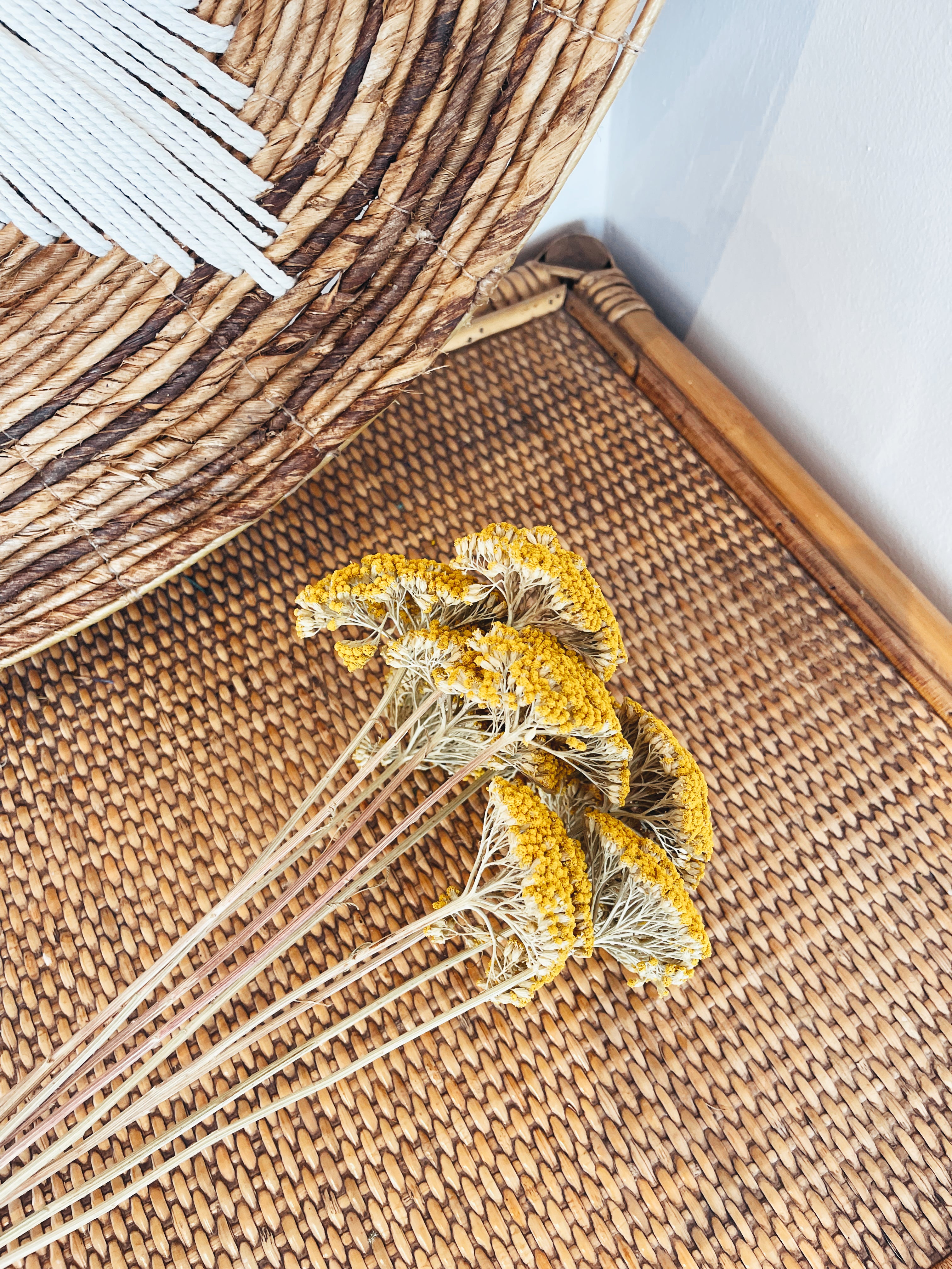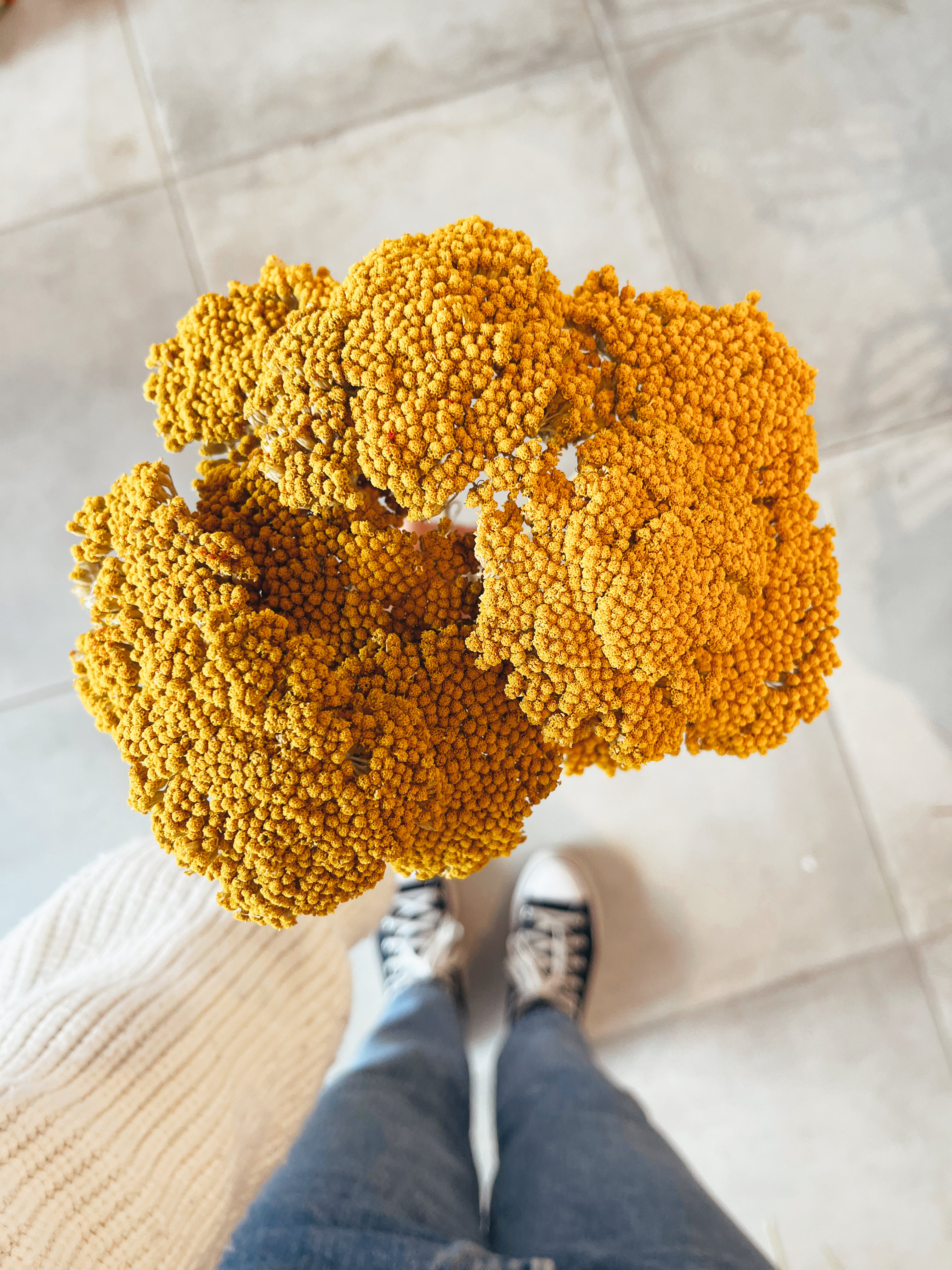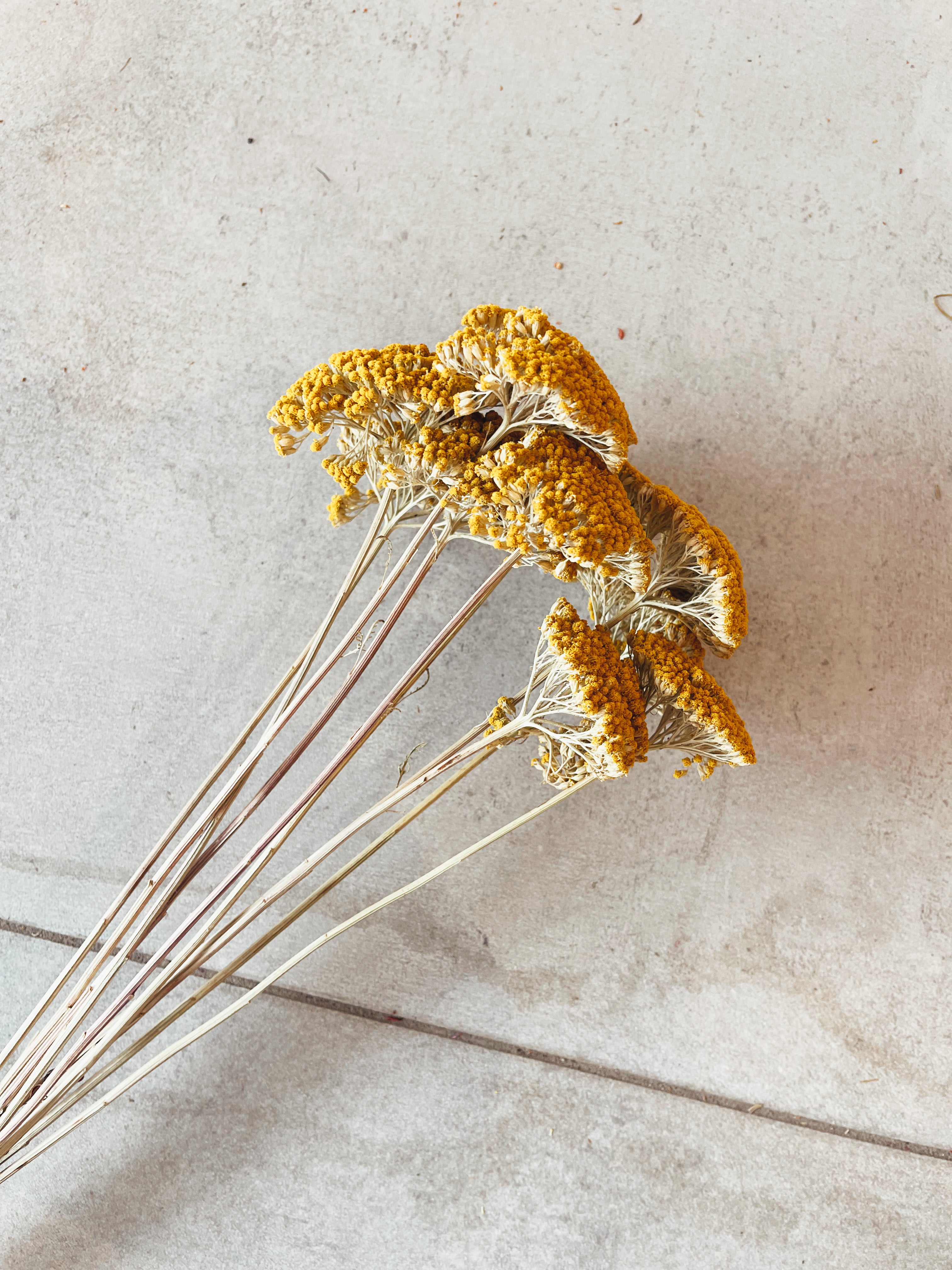 Bouquet de fleurs sèches naturelles préservées Achillea Parker, en tons jaunes vifs, parfaites pour ajouter une touche de nature à n'importe quel espace. L'une des favorites.