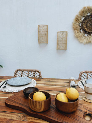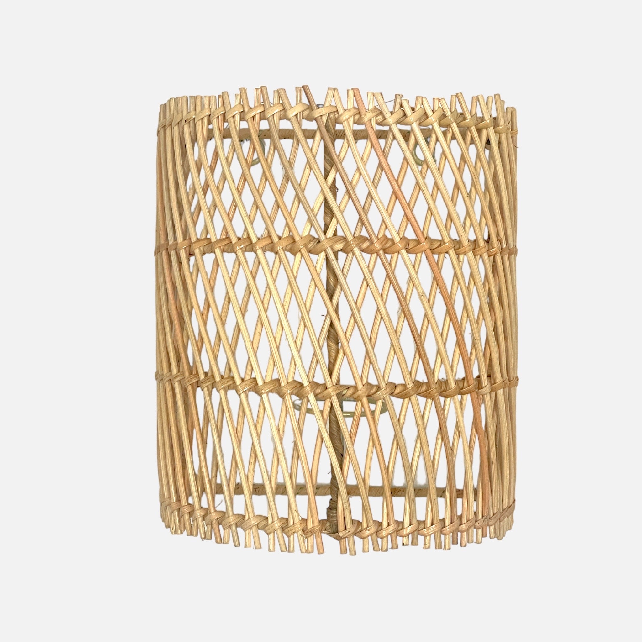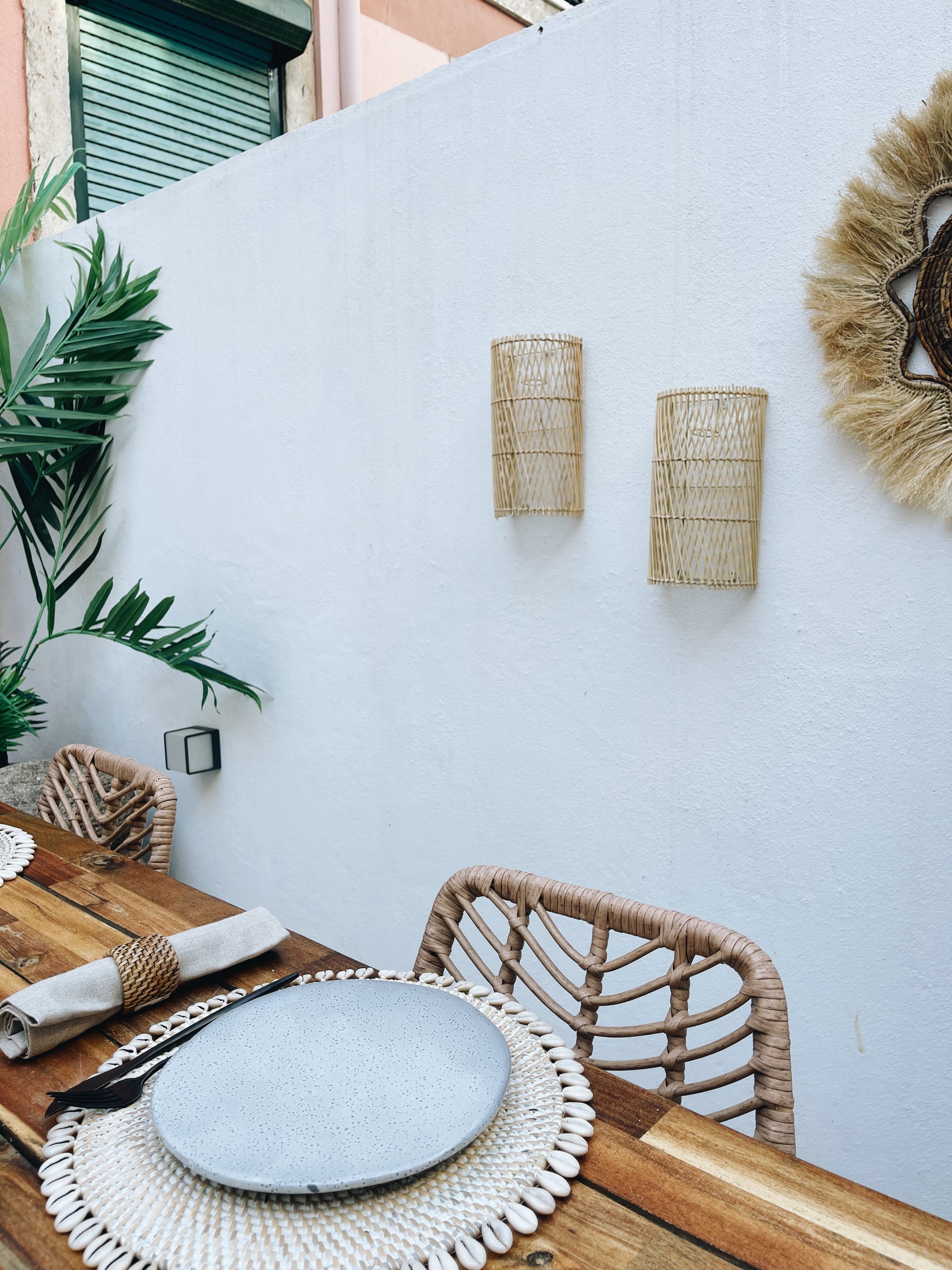 Questa elegante lampada da parete fornisce una luce morbida e diffusa, perfetta per creare un'atmosfera accogliente su qualsiasi parete su cui venga posizionata. Realizzato a mano con cura artigianale, il motivo incrociato del rattan aggiunge un tocco di eleganza naturale alla stanza.