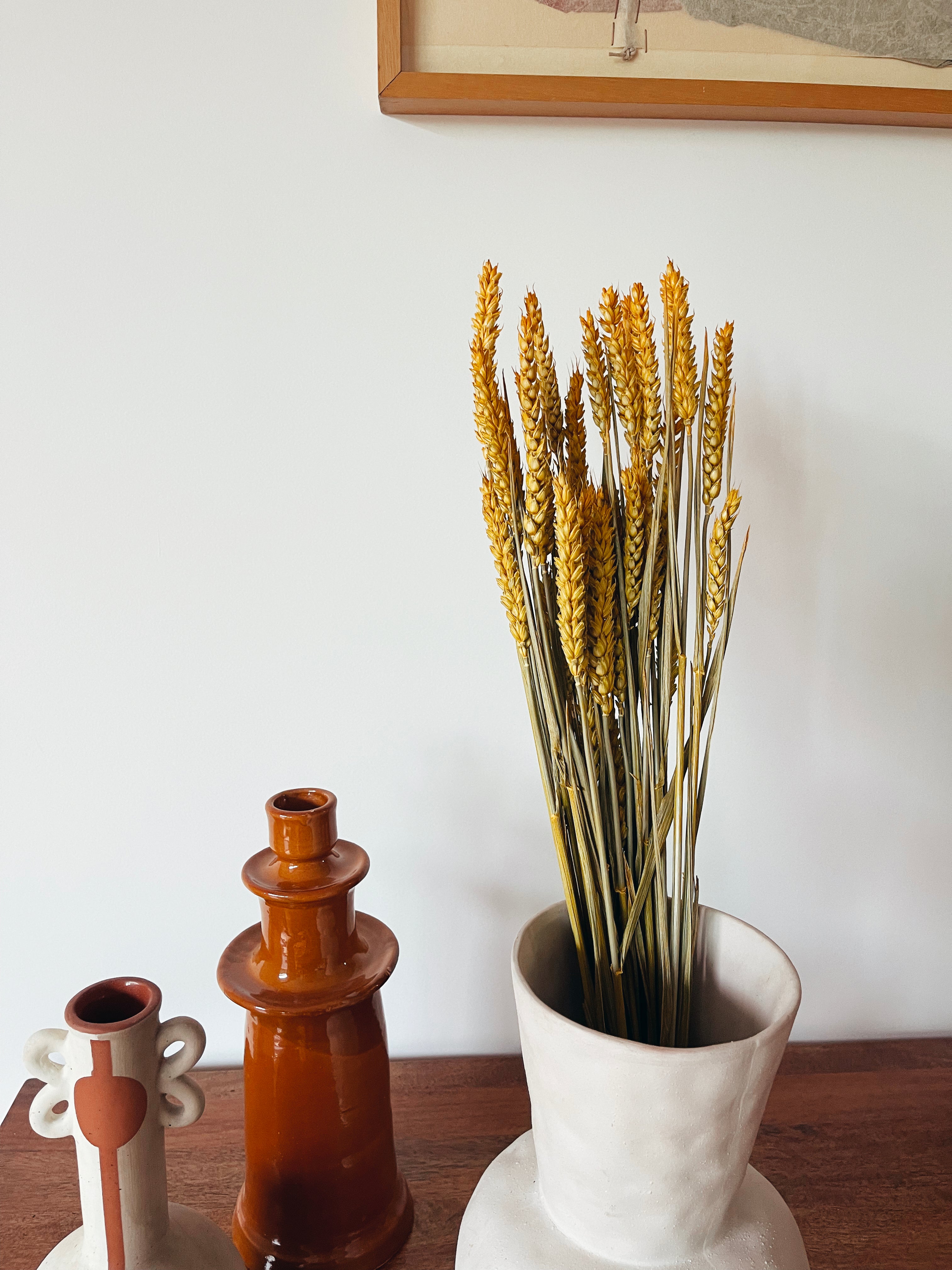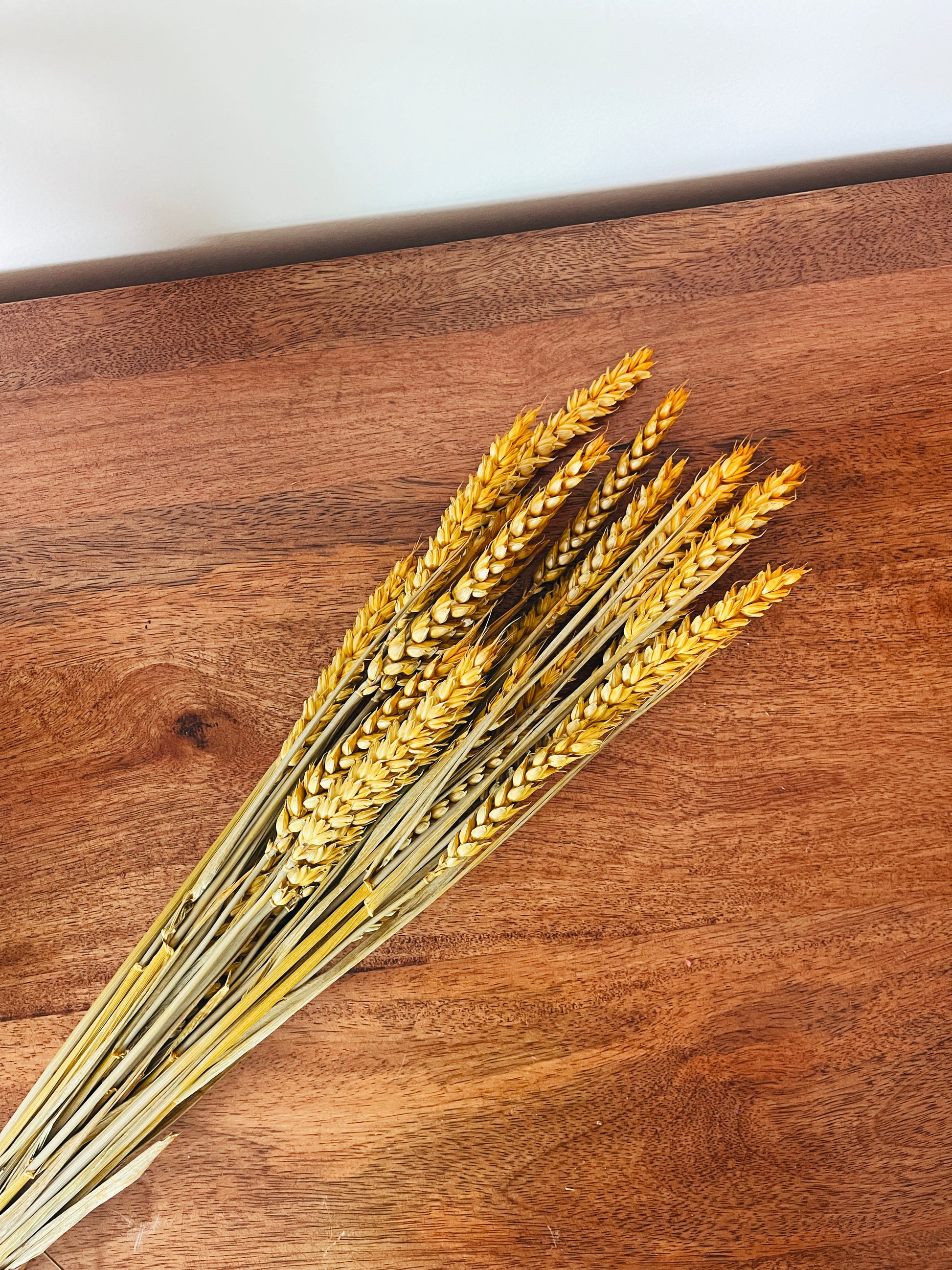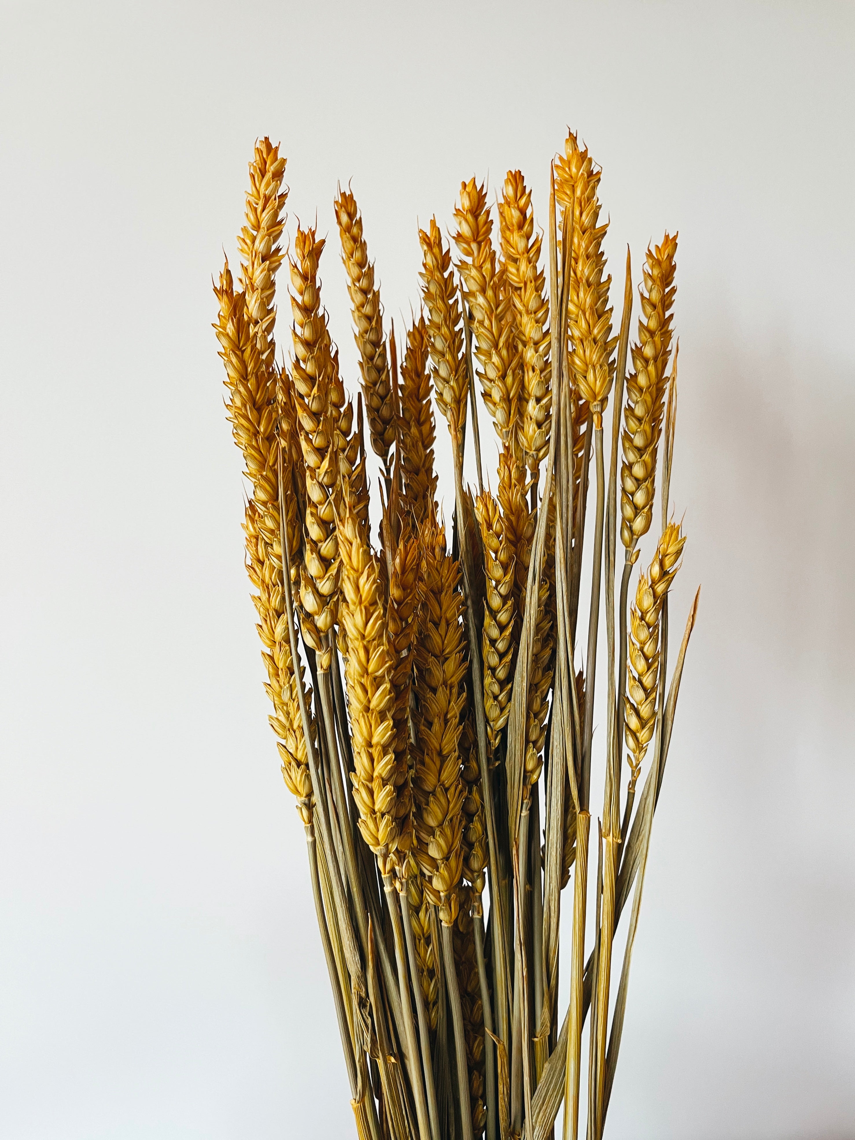 Mazzo di grano essiccato naturale conservato nei toni del giallo, perfetto per aggiungere un tocco di semplicità a qualsiasi spazio.