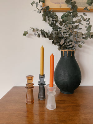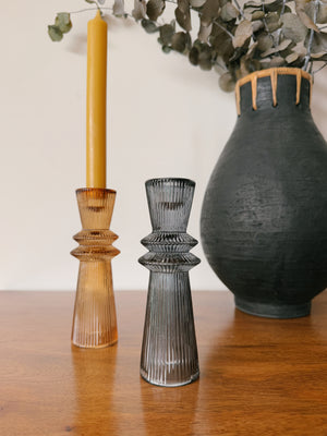 O seu acabamento translúcido realça o brilho da vela, proporcionando uma iluminação suave e envolvente. A sua estrutura alongada confere-lhe um aspeto moderno e intemporal, ideal para complementar diferentes estilos de decoração.