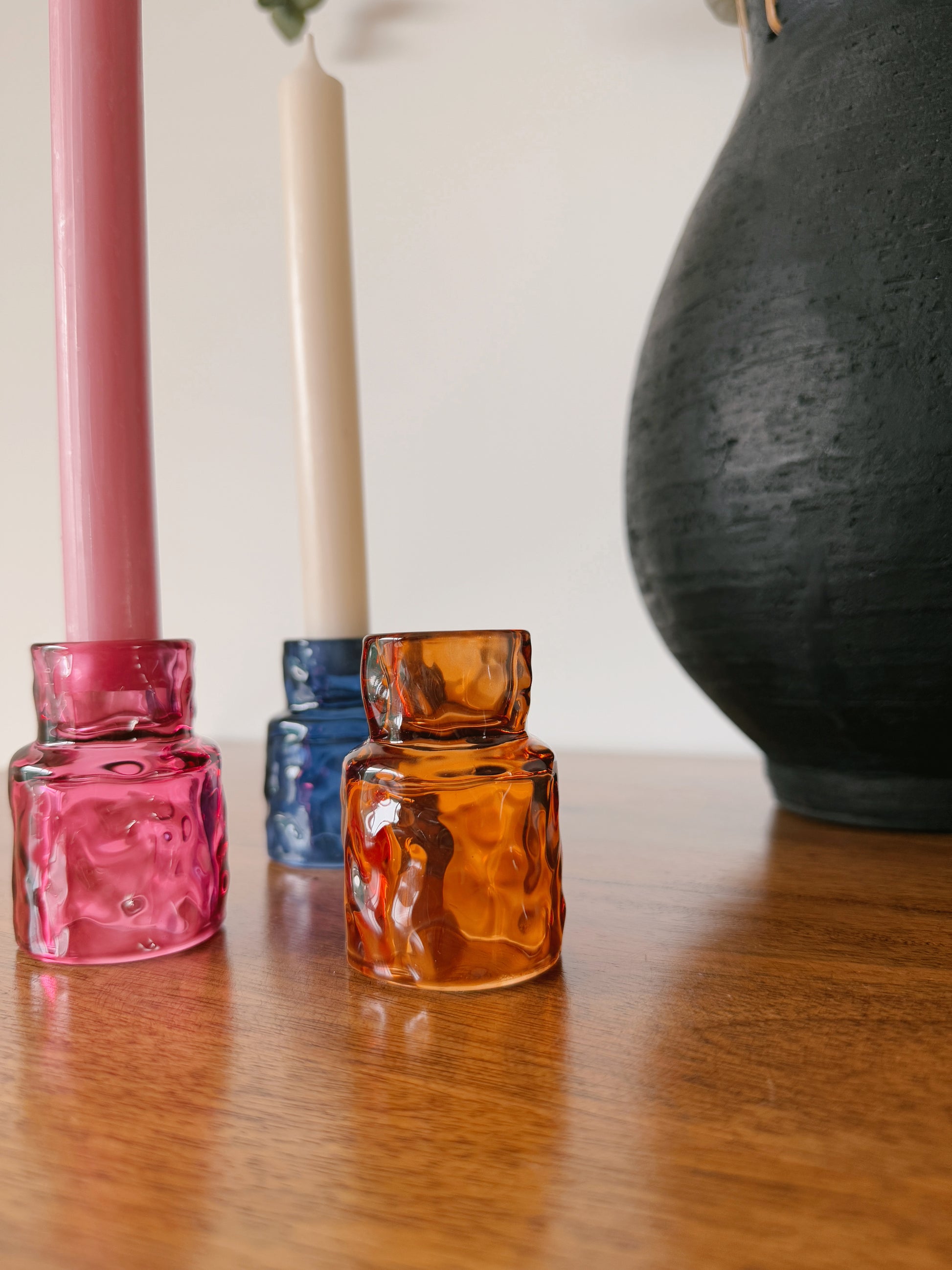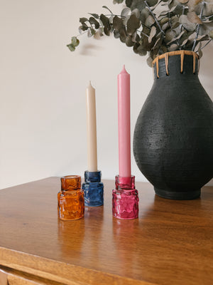 Disponível em três cores vibrantes – laranja, rosa e azul – este porta-velas cria um efeito luminoso encantador quando aceso, refletindo tons suaves e acolhedores. O seu tamanho pequeno torna-o perfeito para mesas, prateleiras ou até como um toque especial na decoração de eventos.