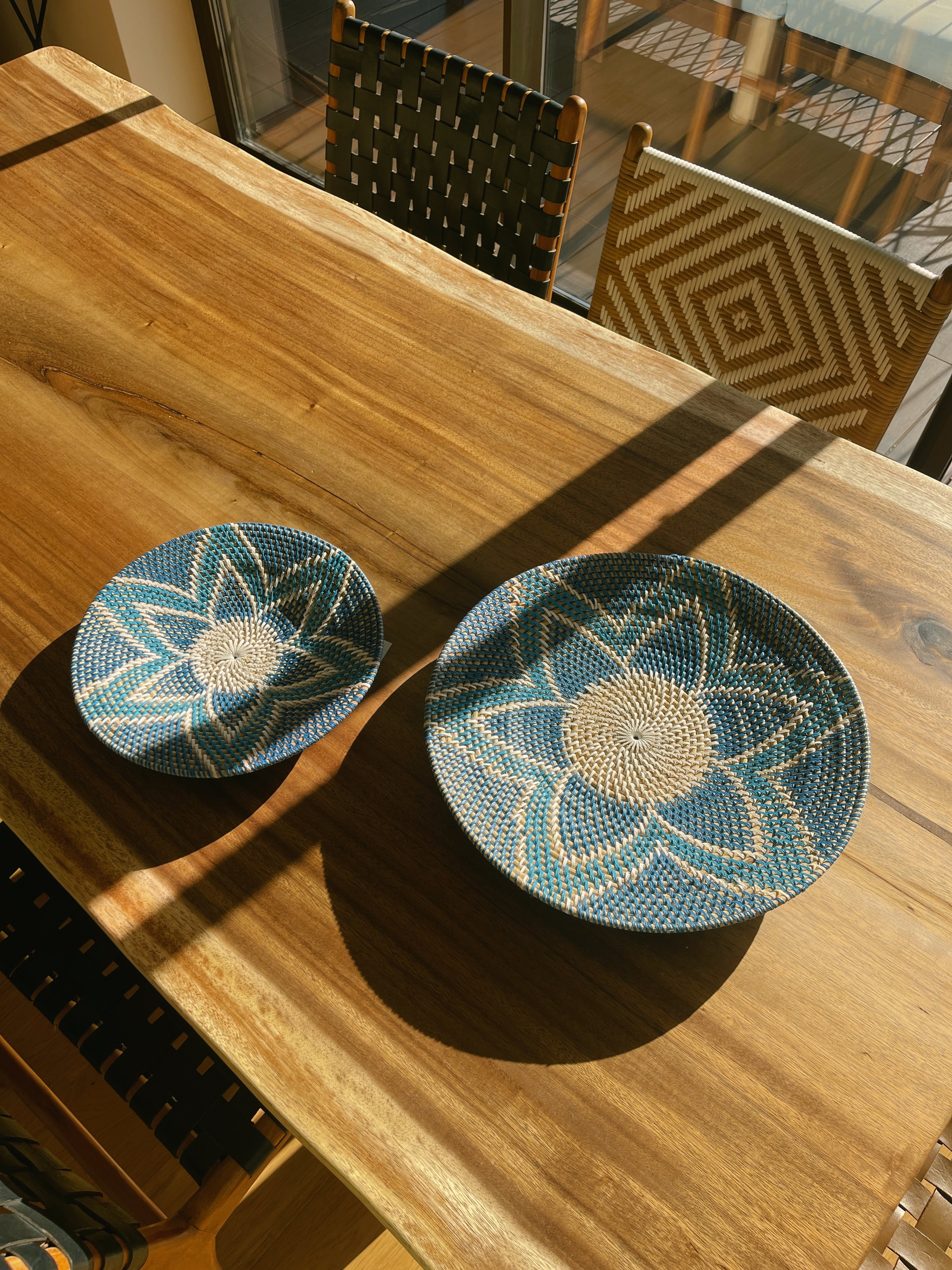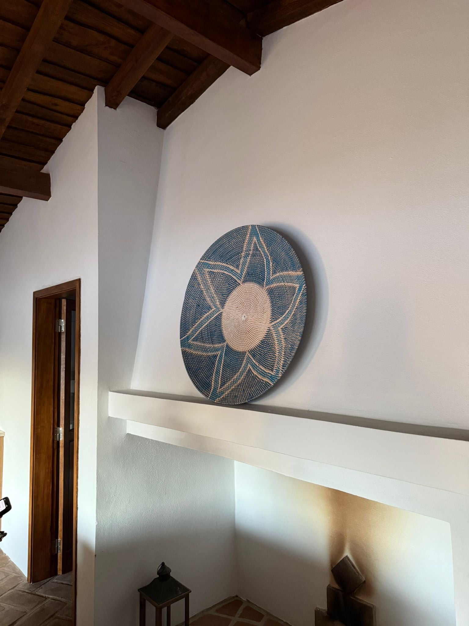 Realizzato a mano con competenza e cura, questo piatto decorativo da parete da 60 cm nei toni del blu è perfetto per aggiungere un tocco naturale e rustico al tuo spazio.