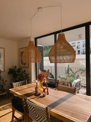 Verhoog de sfeer in uw huis met onze indrukwekkende grote rattan lamp Atambua. Deze lamp is een statement piece, ideaal voor de woonkamer, en voegt een vleugje elegantie en verfijning toe aan uw ruimte. Met een imposant ontwerp en een robuuste structuur van rattan trekt deze lamp de aandacht en steekt hij eruit als een centraal element in de decoratie.