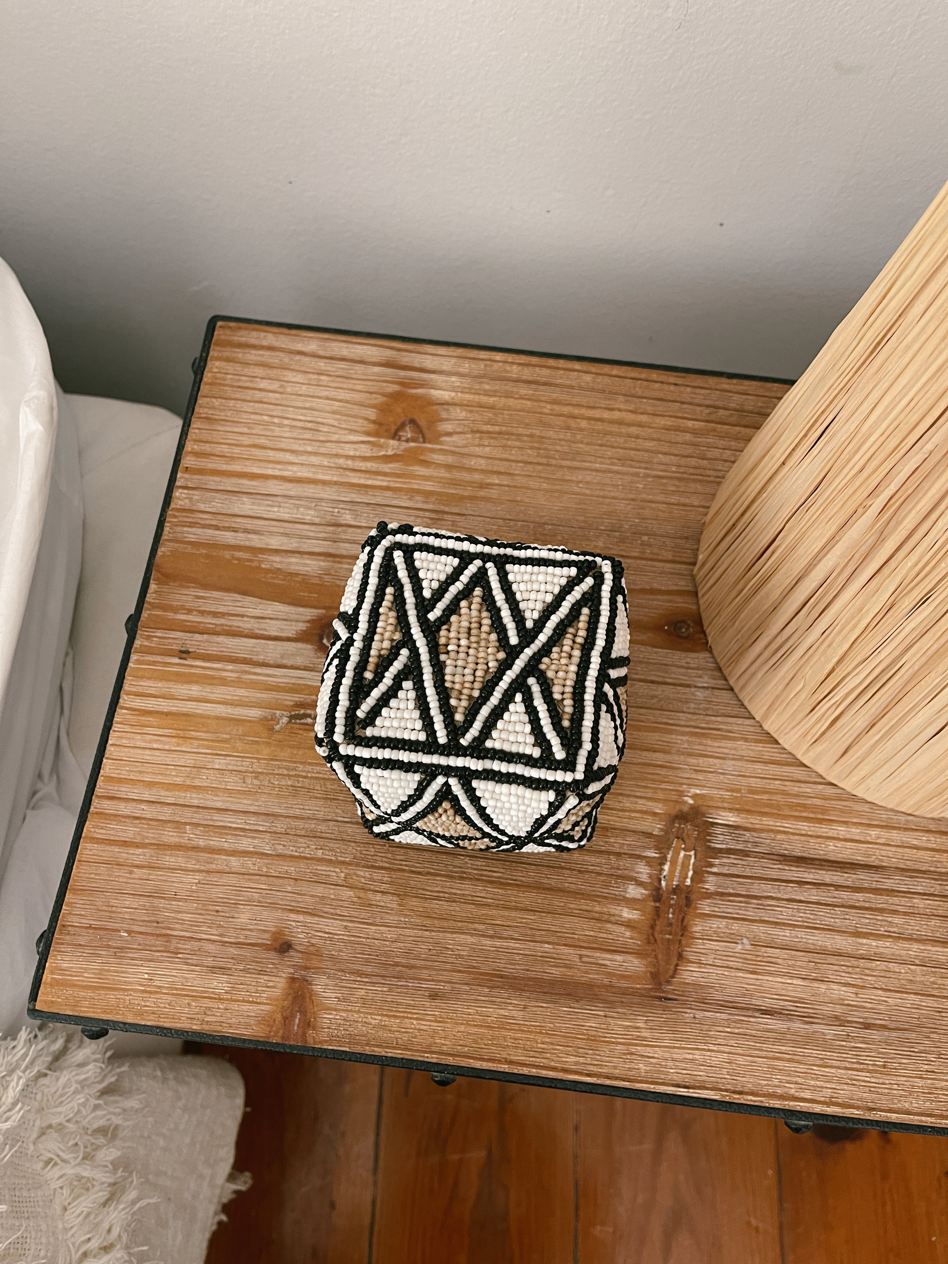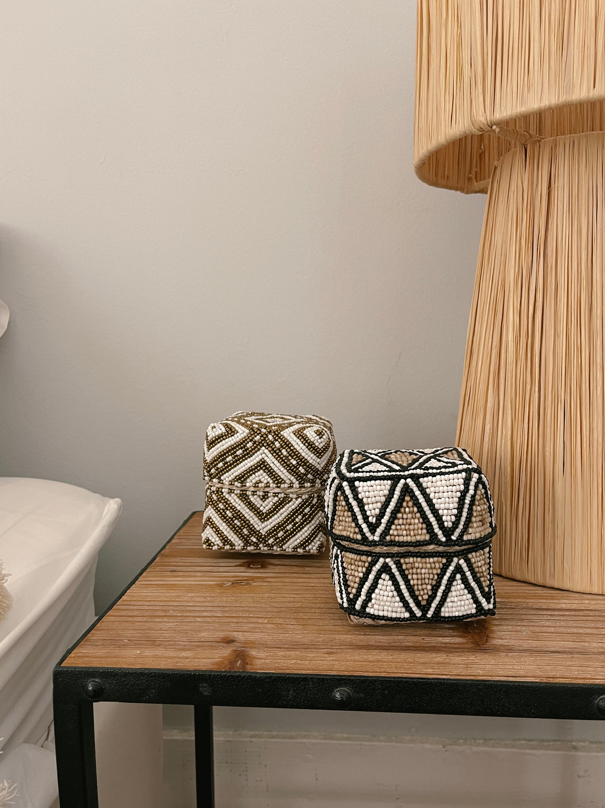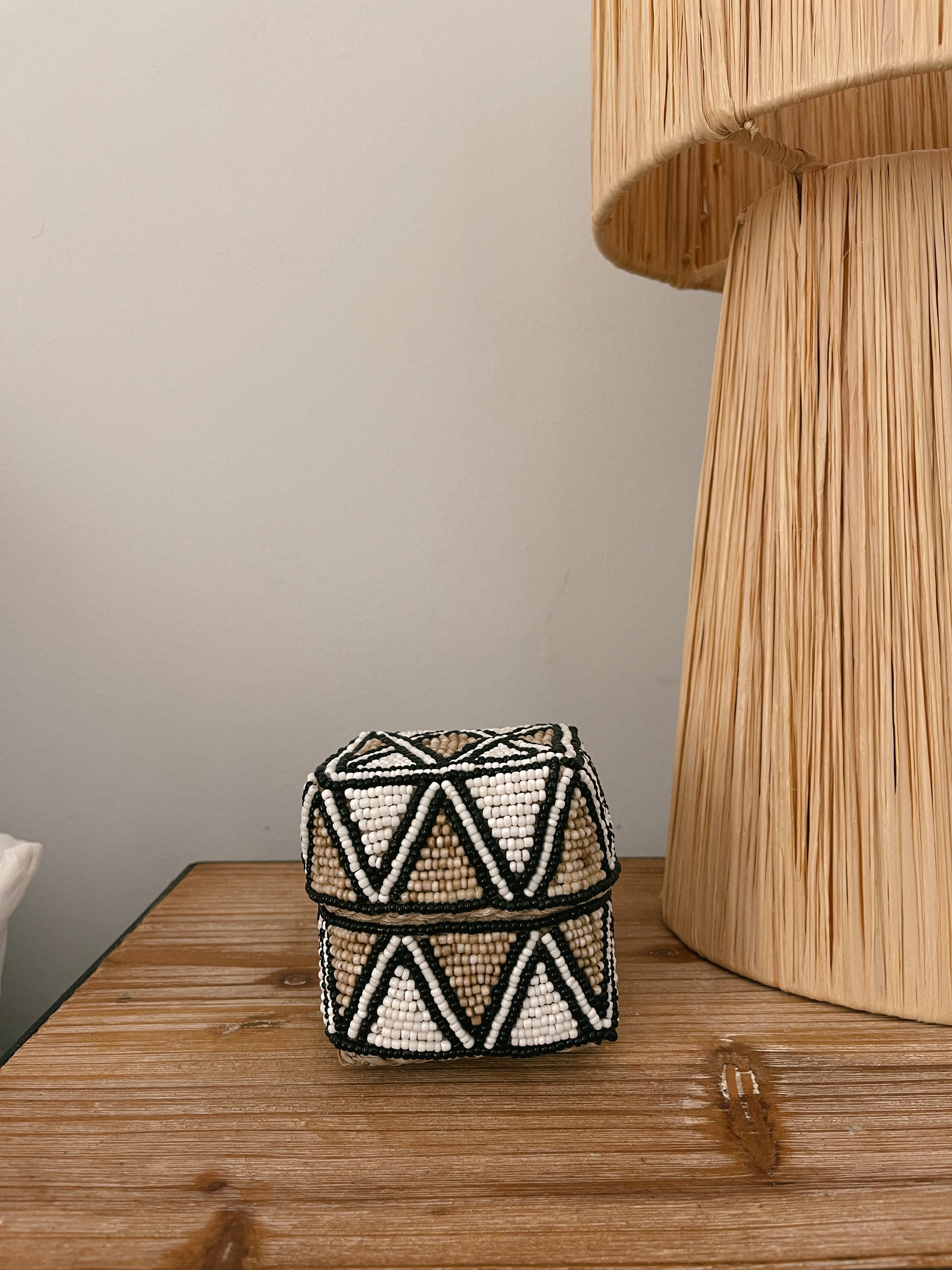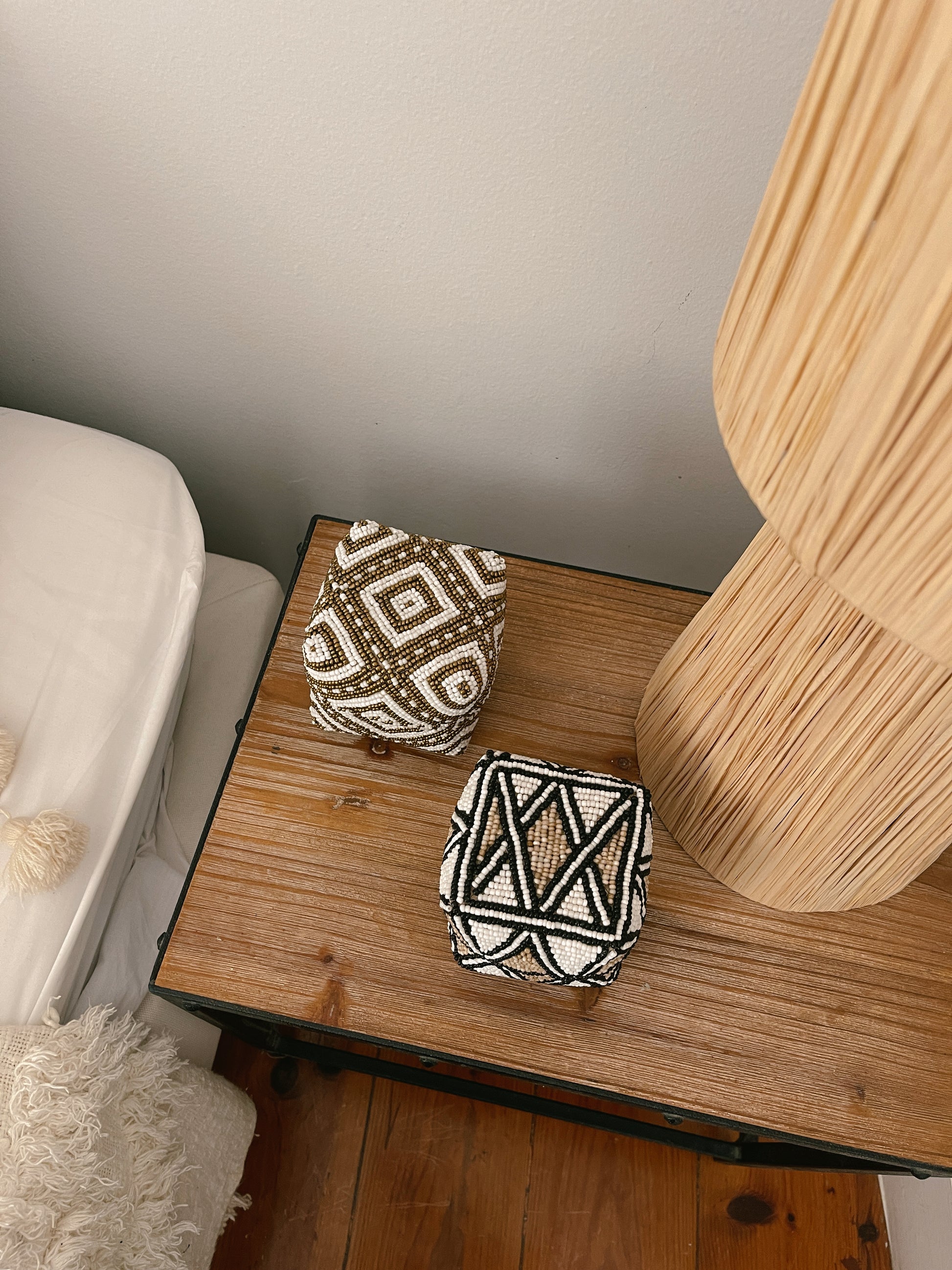 Versier uw huis met een vleugje boho chic stijl met onze handgemaakte bamboe doos, versierd met kralen in een wit en gouden patroon. Deze charmante doos is meer dan alleen een eenvoudig juwelendoosje - het is een unieke decoratieve piece die charme en persoonlijkheid aan uw ruimte zal toevoegen.