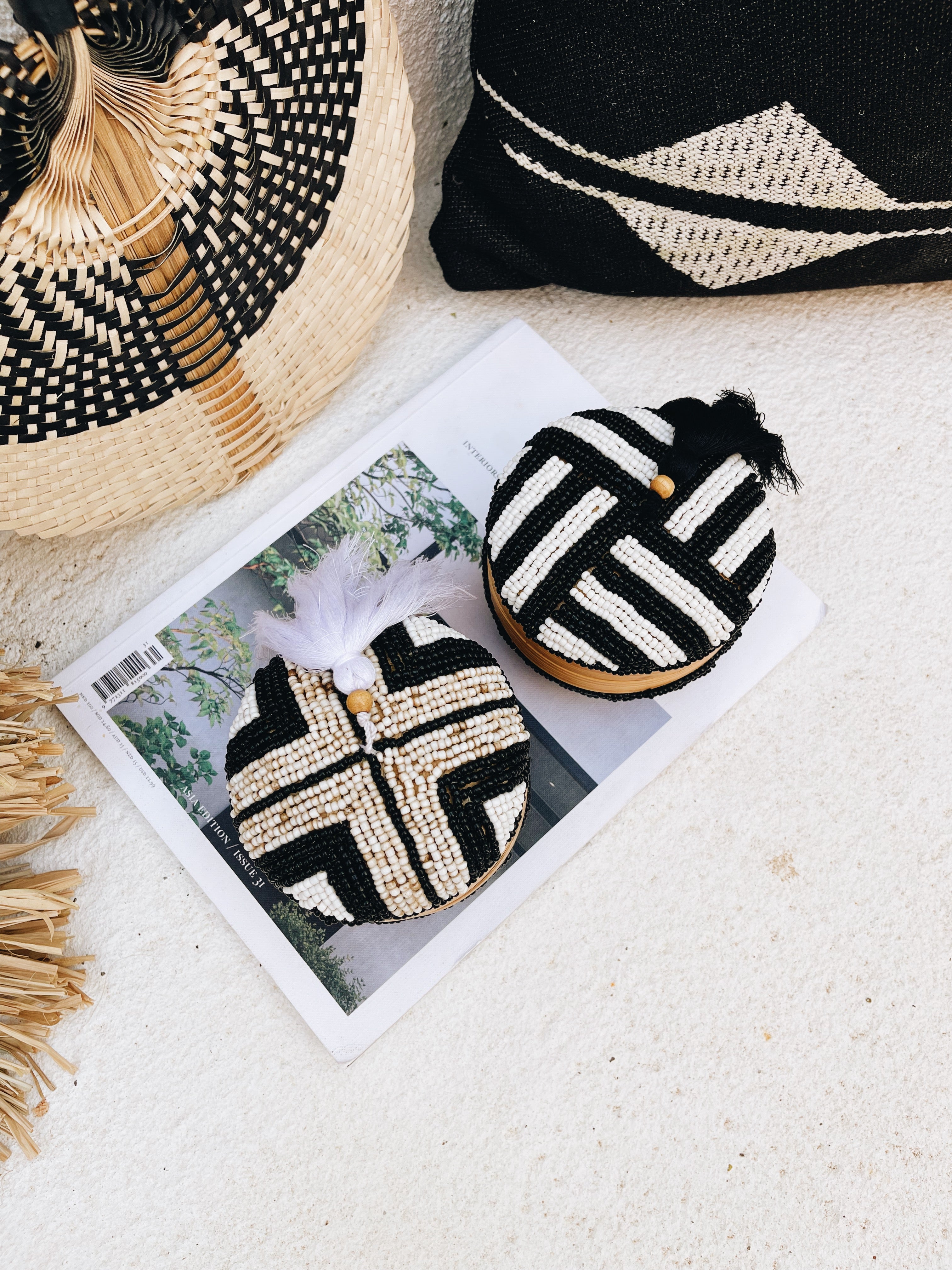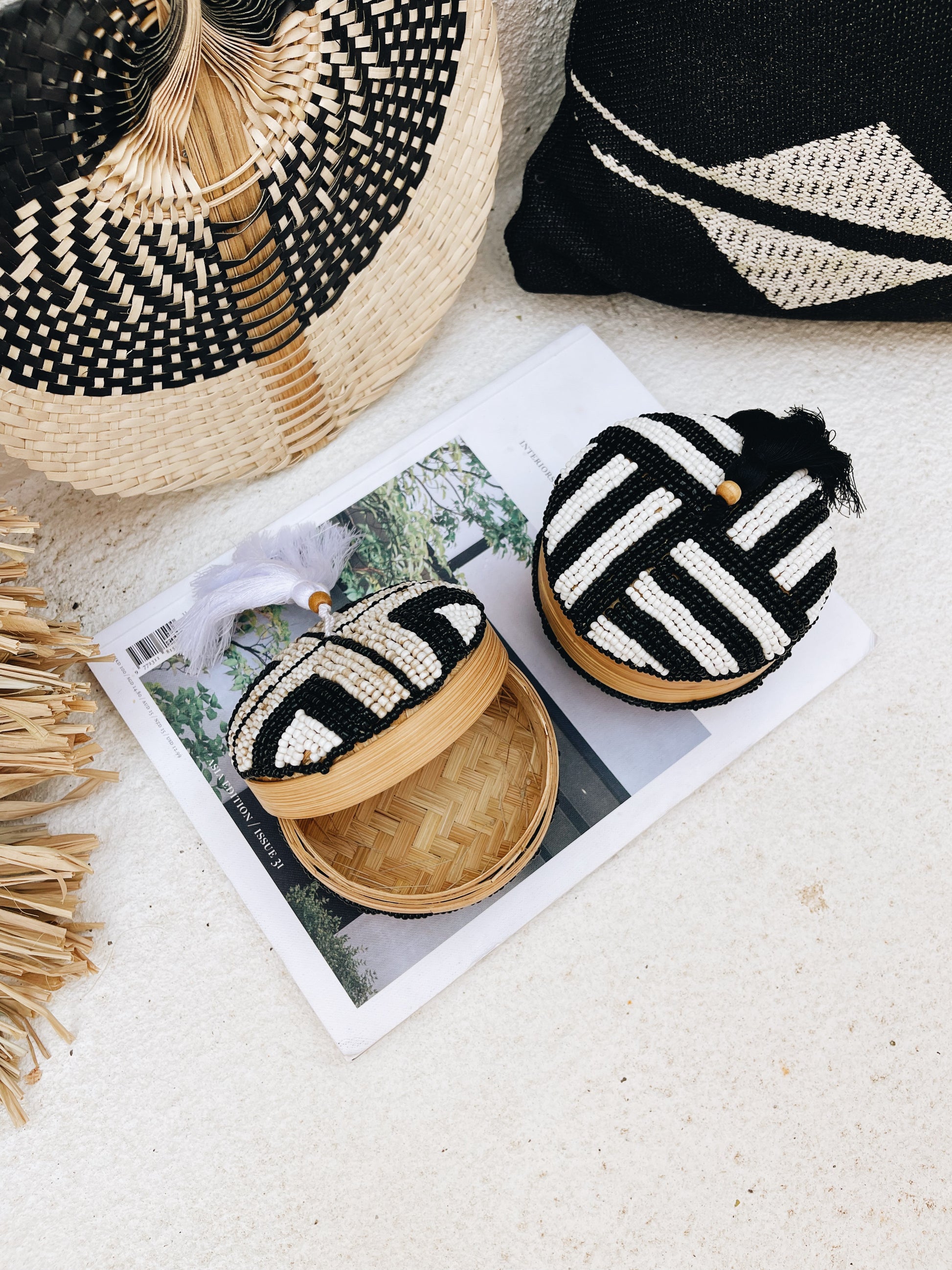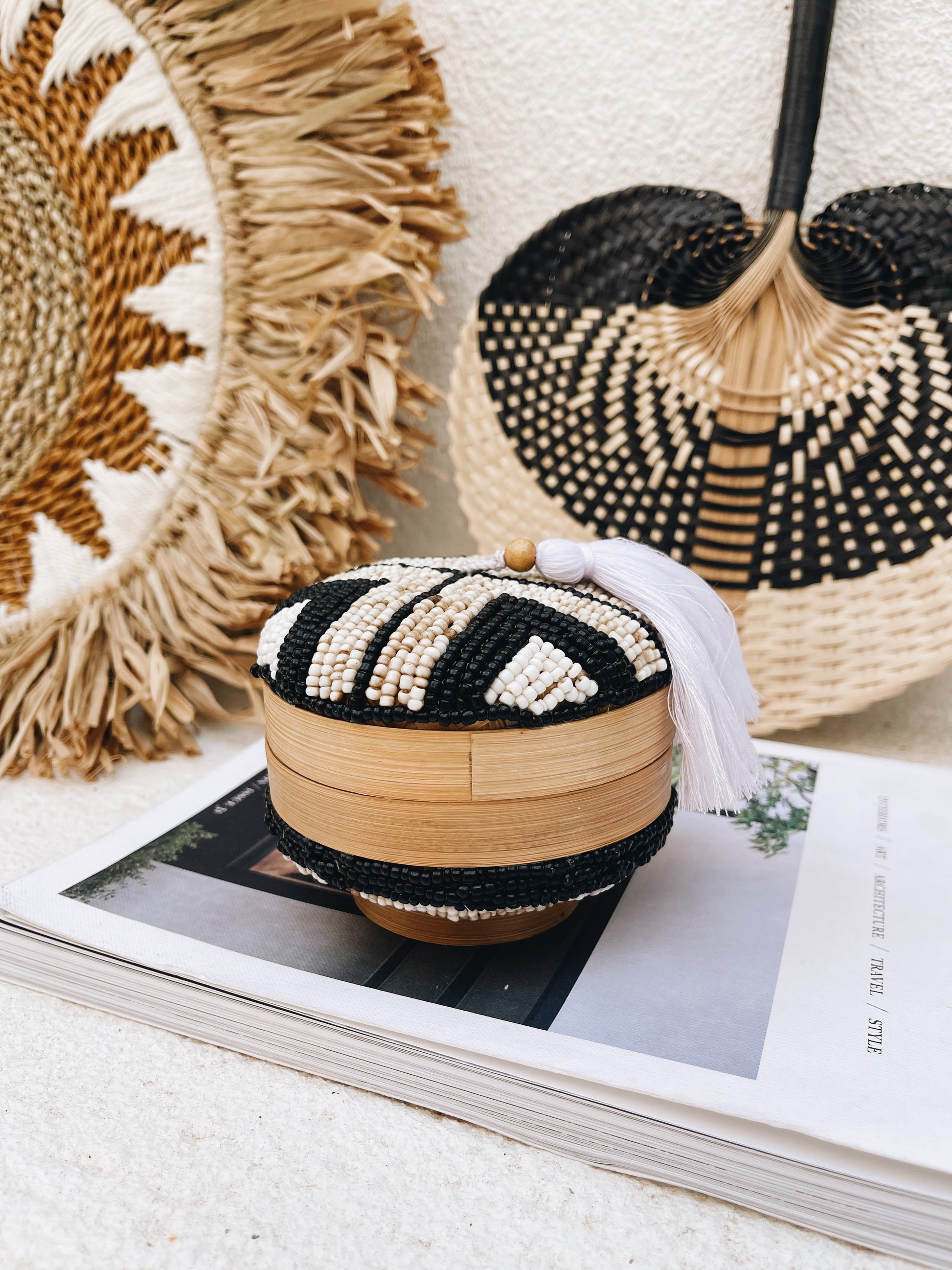 Versier uw huis met een vleugje boho chic stijl met onze handgemaakte ronde bamboe doos, versierd met kralen in een zwart, wit en beige gestreept patroon. Deze charmante doos is meer dan alleen een eenvoudig juwelenhouder - het is een uniek decoratief stuk dat charme en persoonlijkheid aan uw ruimte zal toevoegen.