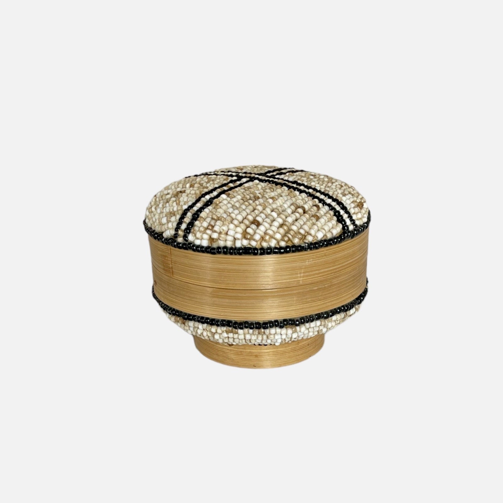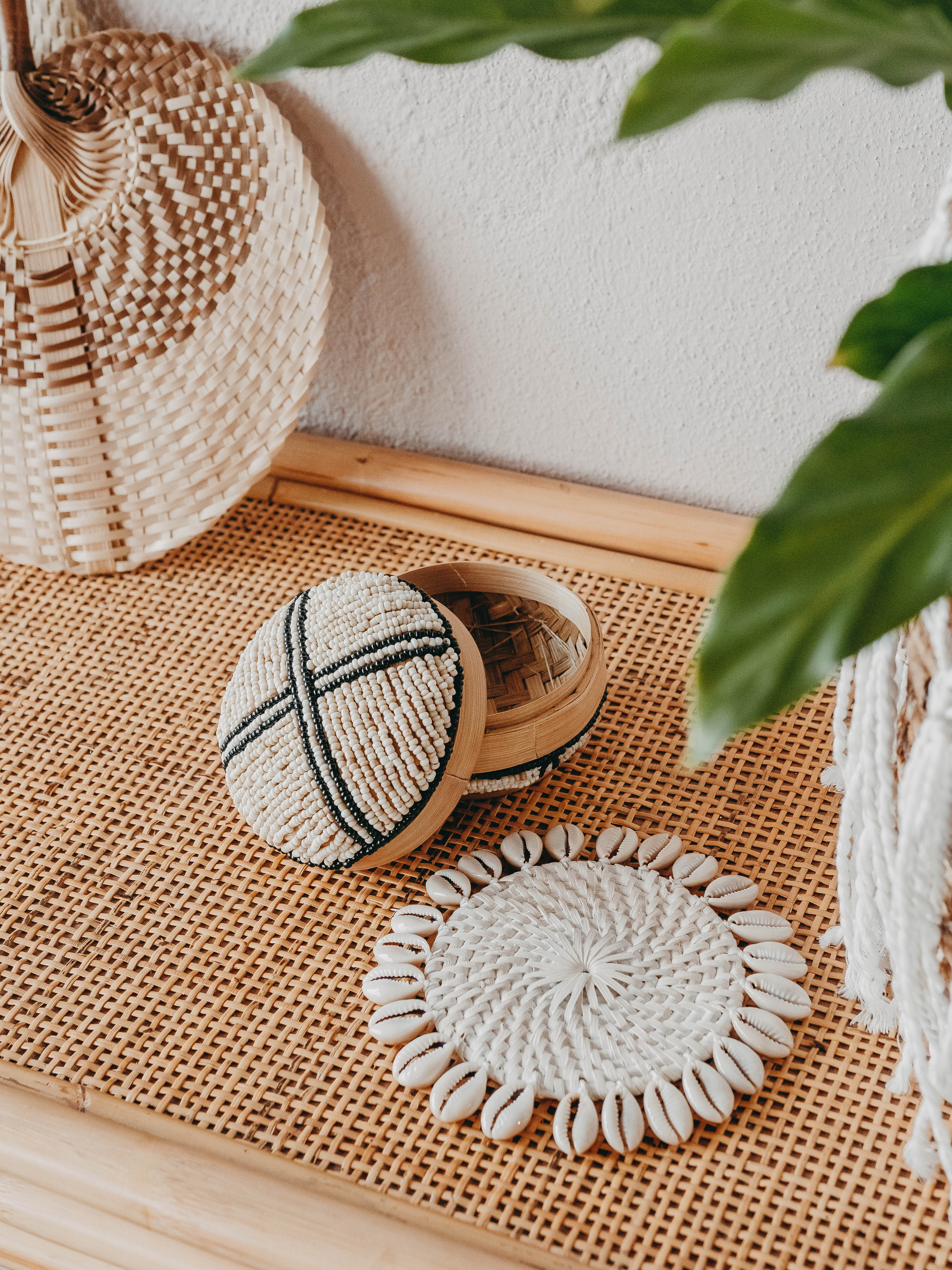 Versier uw huis met een vleugje boho chic met onze handgemaakte ronde bamboe doos, versierd met kralen in een beige en zwarte patroon. Deze charmante doos is meer dan alleen een eenvoudig juwelendoosje - het is een unieke decoratieve piece die charme en persoonlijkheid aan uw ruimte zal toevoegen.