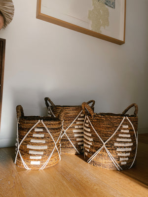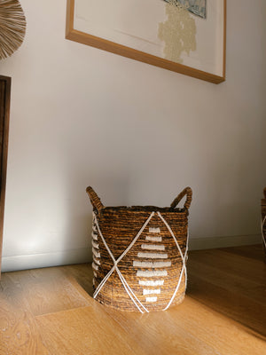 Feitos de folha de bananeira e fios de algodão cuidadosamente entrelaçados, o Cesto Alila (nos tamanhos S, M e L) são perfeitos para qualquer canto da casa. Aprecie a beleza feita à mão dos nossos cestos, cuidadosamente fabricados por artesãos dedicados!