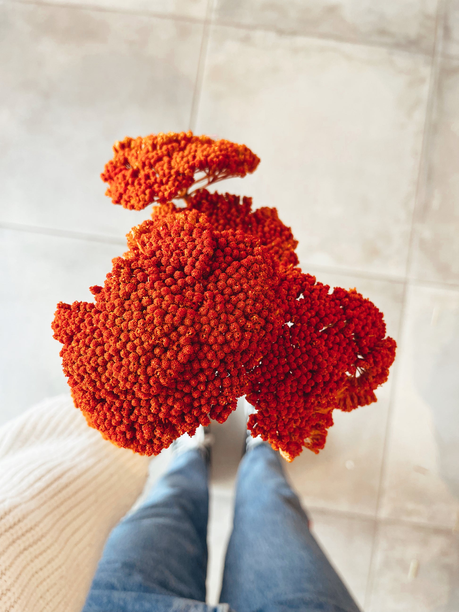 Droogboeket van natuurlijke, geconserveerde Achillea Parker in roodachtige tinten, perfect om een vleugje natuur aan elke ruimte toe te voegen. Een van de favorieten.