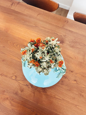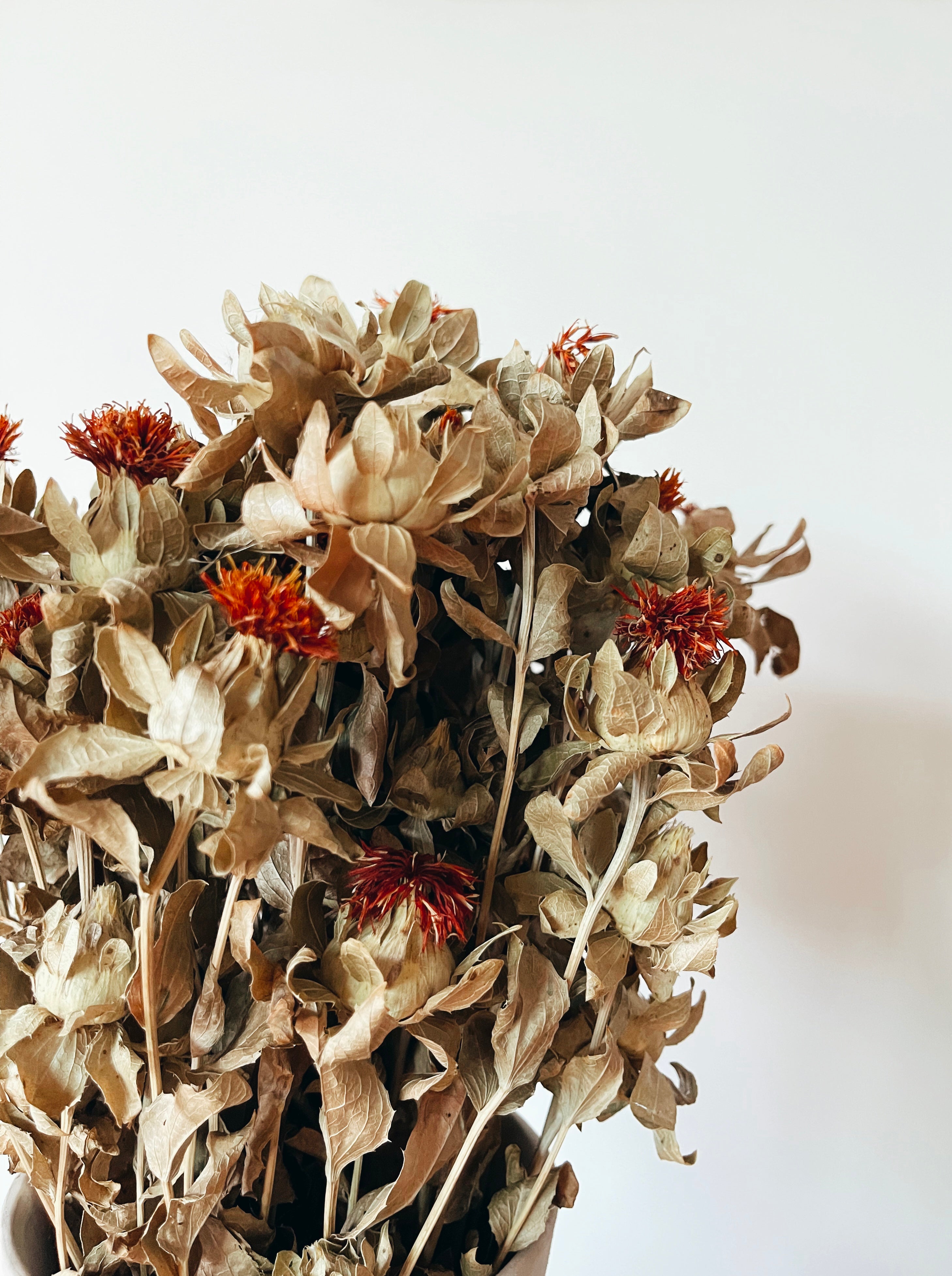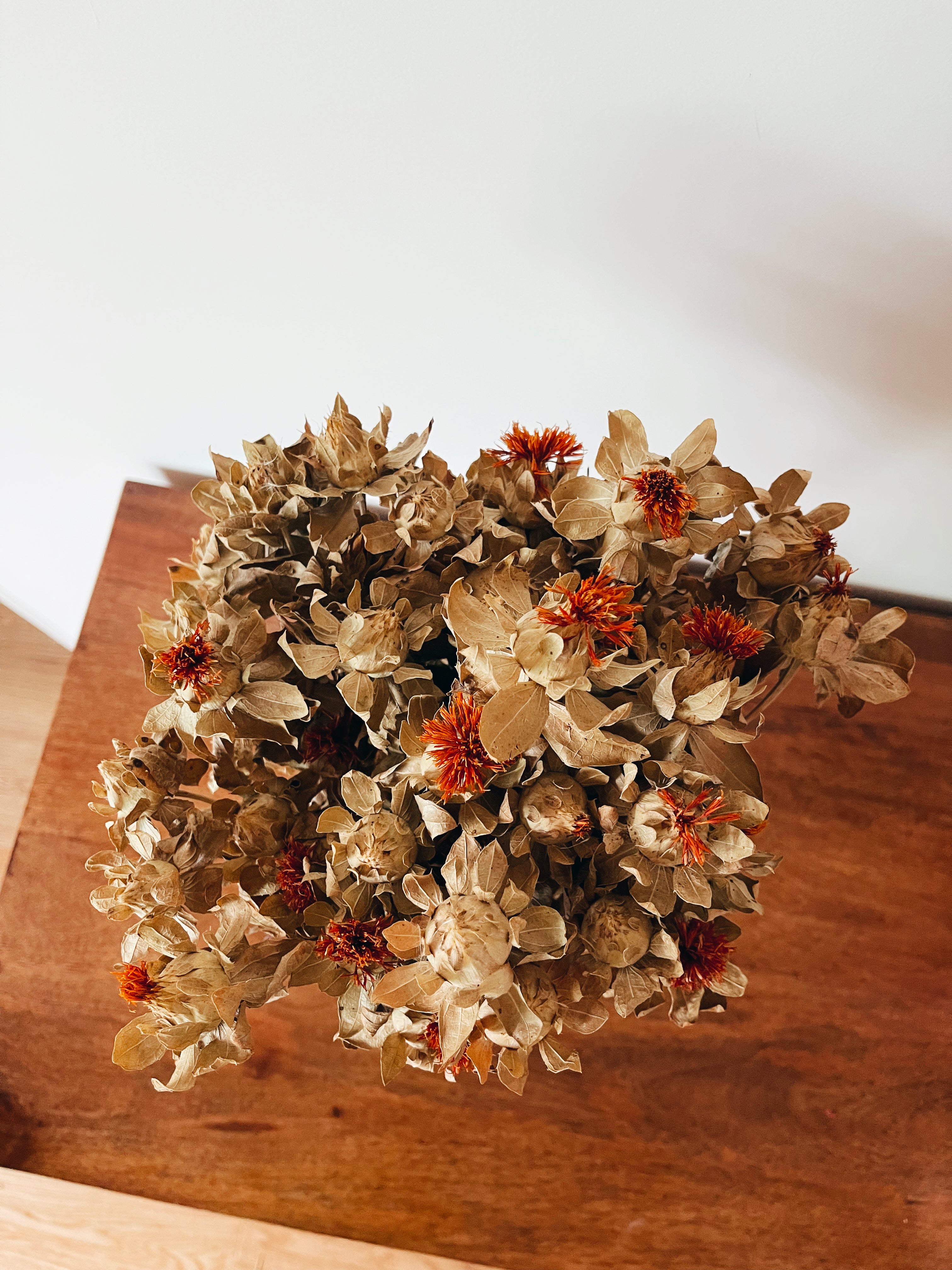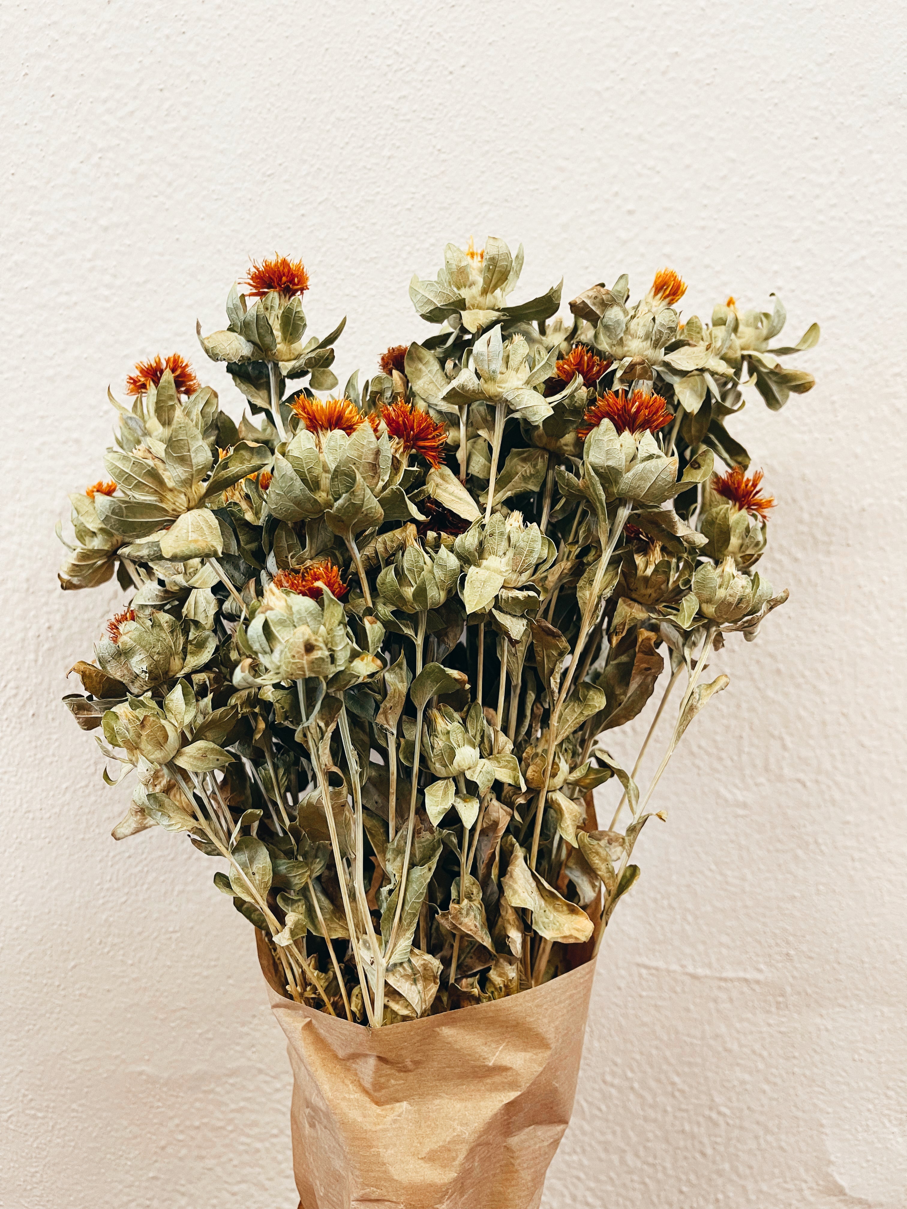 Droogboeket van natuurlijke, geconserveerde Carthamus bloemen in groene en oranje tinten, perfect om een vleugje schoonheid aan elke ruimte toe te voegen.