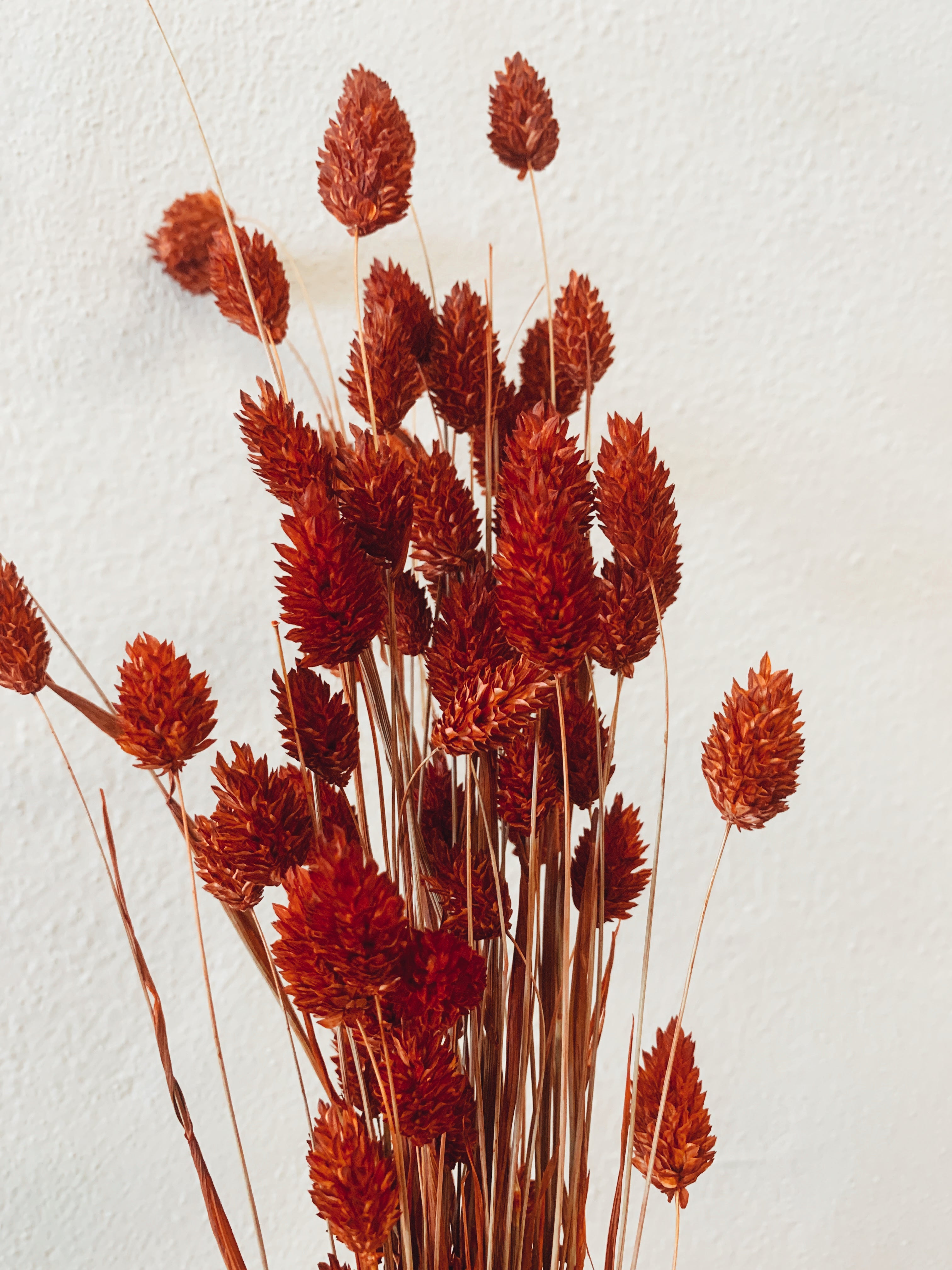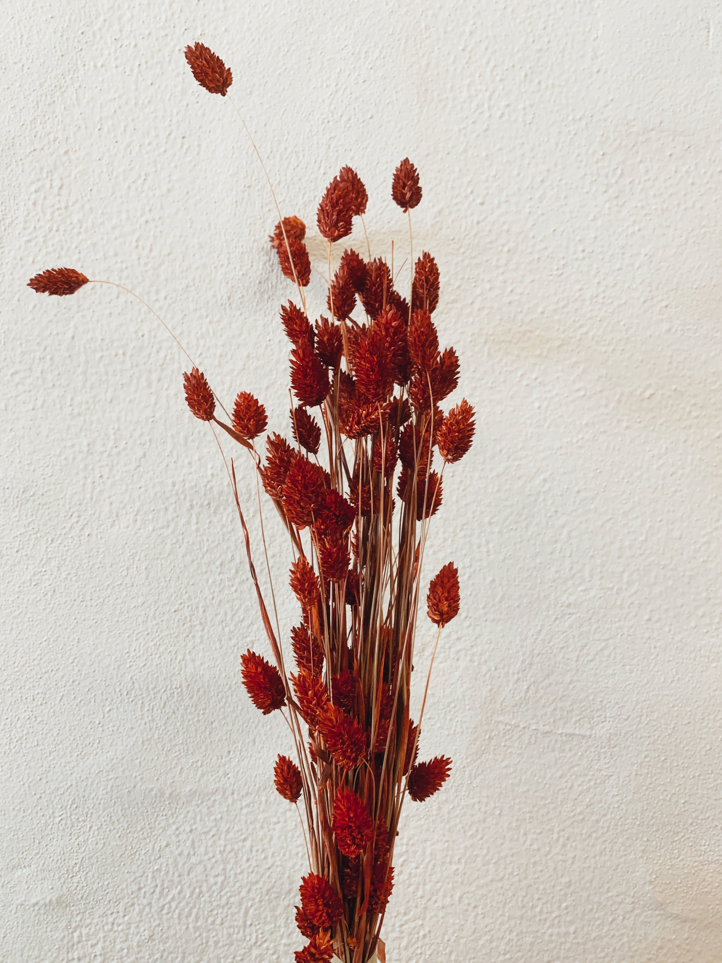 Droogboeket van natuurlijke Phalaris bloemen, in tinten in het rood, perfect om een vleugje natuur aan elke ruimte toe te voegen.