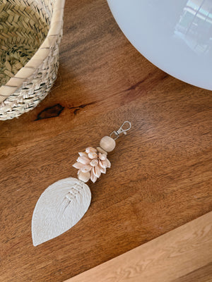 Sleutelhanger met schelpen en witte katoenen draden, van kleine grootte met witte houten details die je overal mee naartoe kunt nemen!