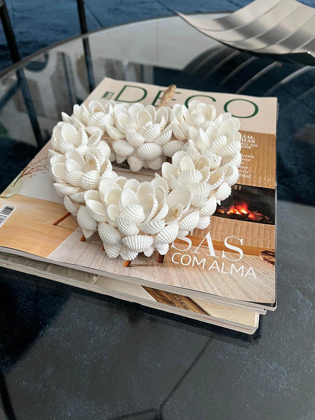 Feito à mão com conchas brancas naturais, promovendo uma decoração sustentável e eco-friendly.