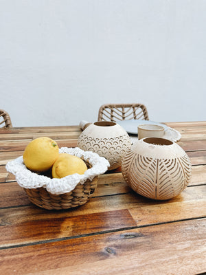 Todas as nossas peças são feitas à mão e, portanto, únicas, permitindo que o espírito do artesão que os fez seja capturado no seu design.