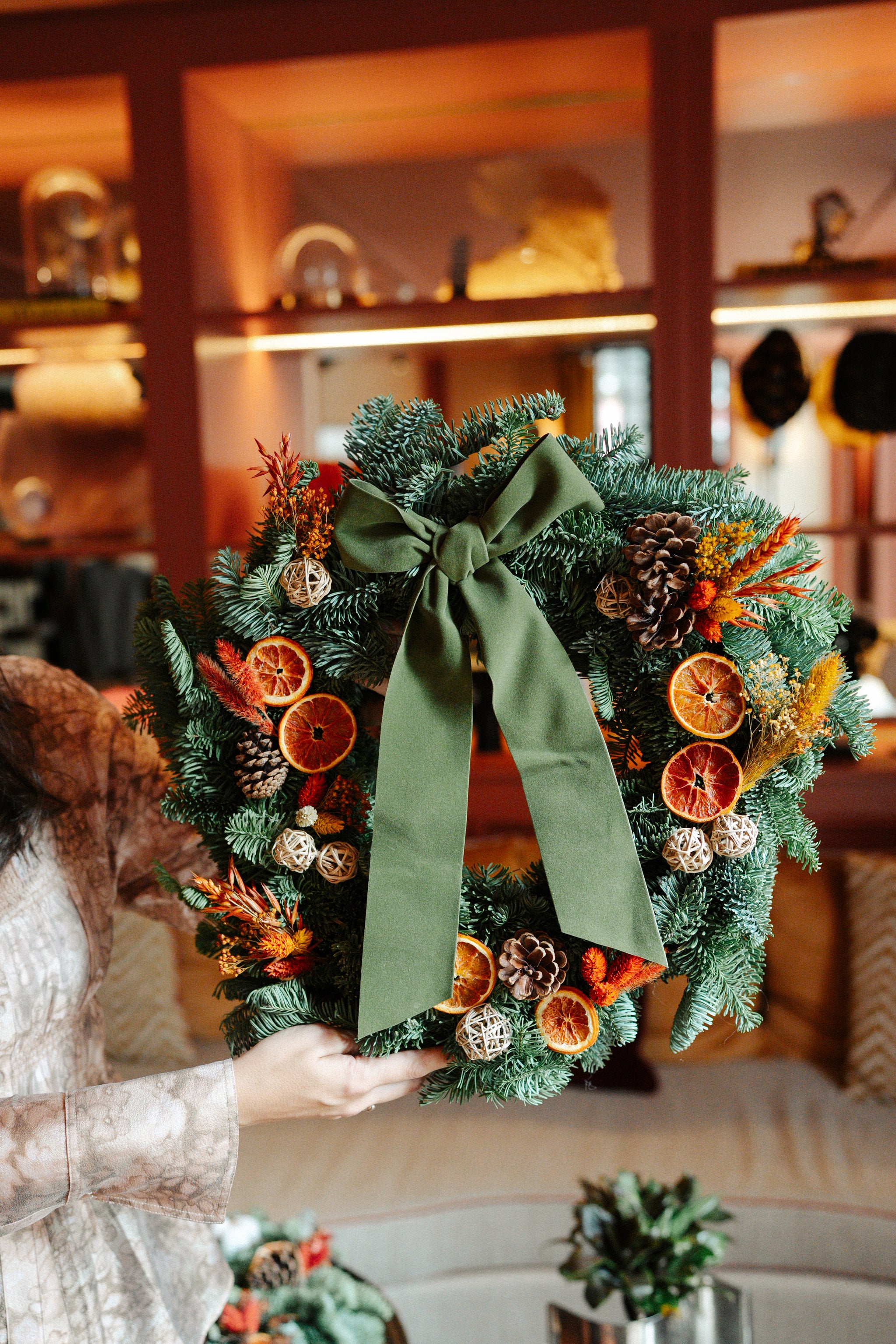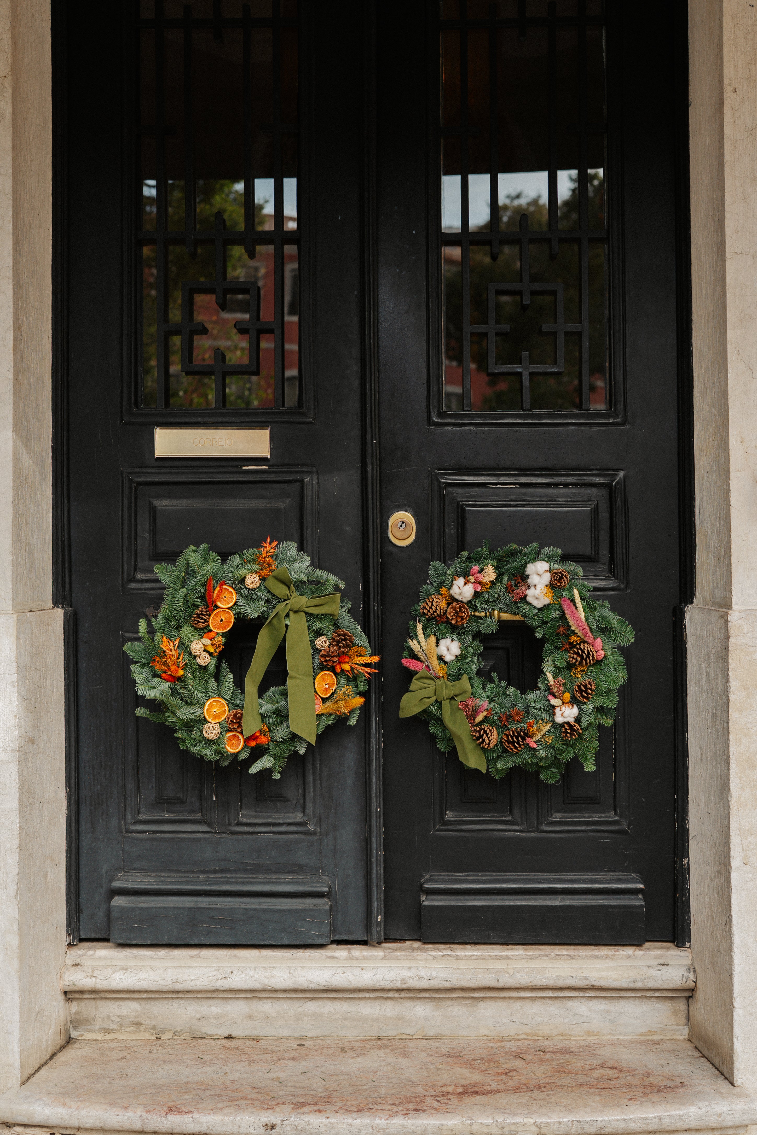 ✨ Cada coroa é cuidadosamente elaborada com flores secas selecionadas e ramos de pinheiro natural; todas feitas à mão com fita.