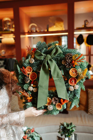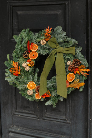 Adicione um toque de elegância natural à sua decoração Natalícia com esta linda coroa redonda feita à mão. Combinando a delicadeza da laranja desidratada, das pinhas, de uns toques de flores secas em tons laranjas e naturais, com o aroma fresco do pinheiro, esta peça é perfeita para trazer o espírito de Natal para a sua casa.