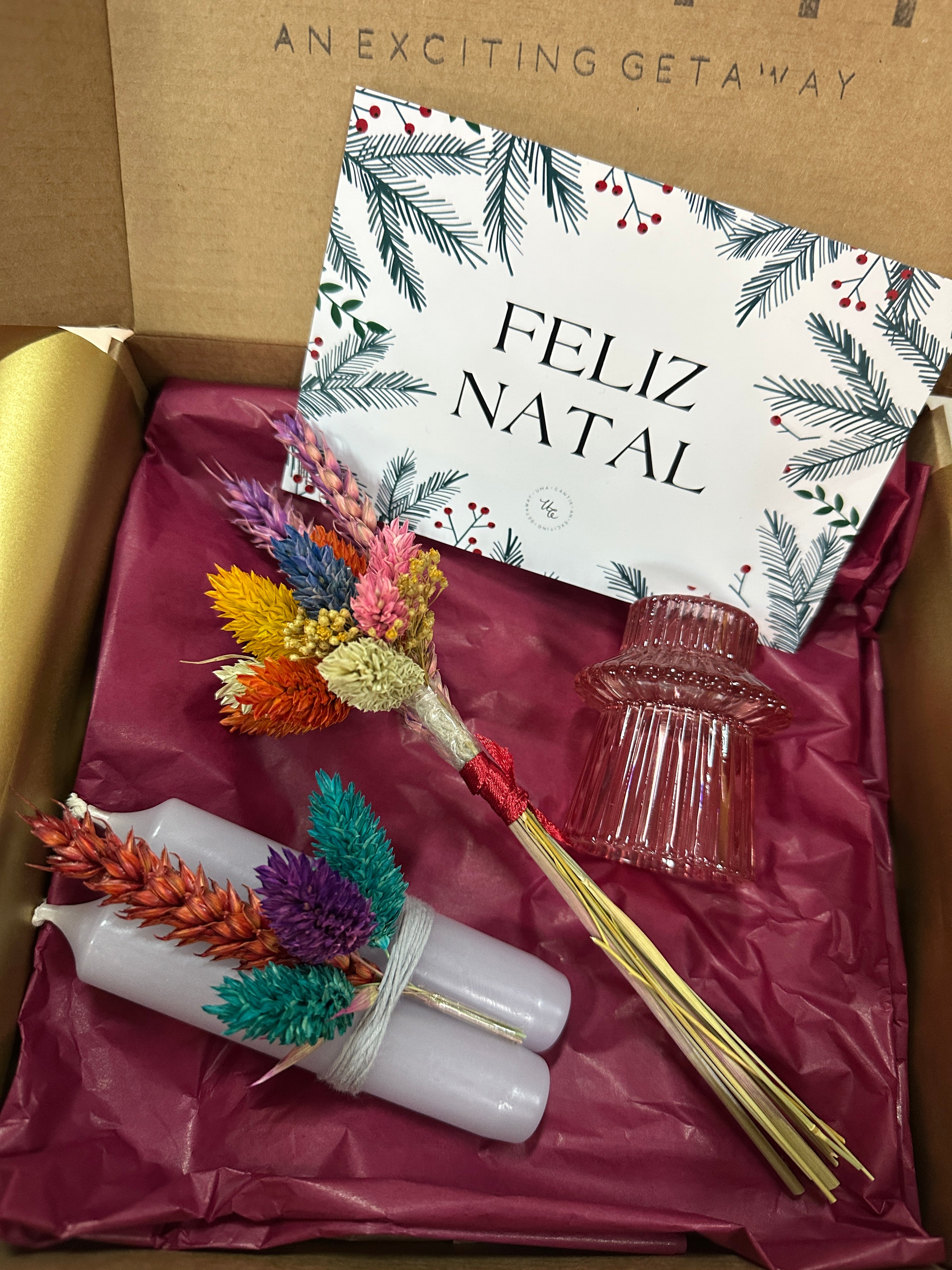 - Embalagem especial: uma caixa elegante, decorada com detalhes natalícios, pronta para oferecer e um cartão de boas festas.